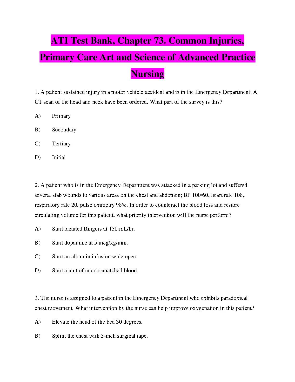 TEST BANK FOR ATI Test Bank, Chapter 73. Common Injuries, Primary Care Art and Science of Advanced Practice Nursing