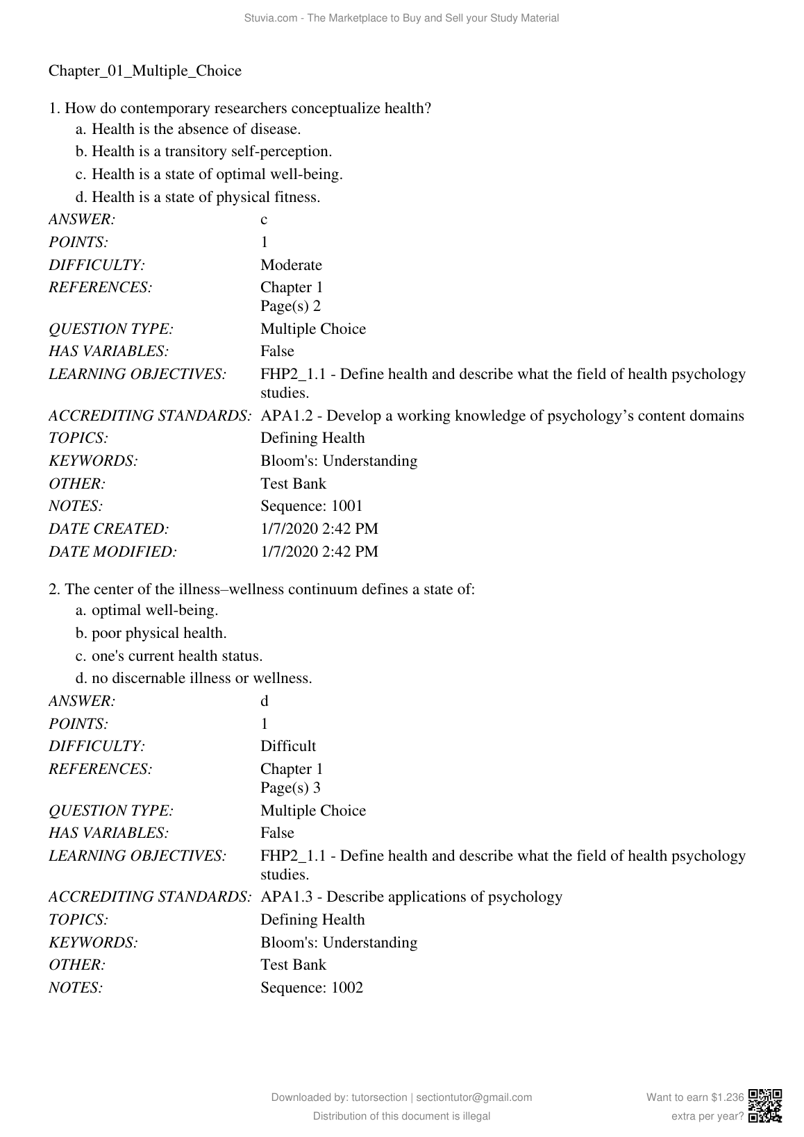 Test Bank for Health Psychology, 2nd Edition by Leslie D. Frazier, Kenneth A. Mac-Farlane, & Patricia A. K. Ristau (All Chapters Included)