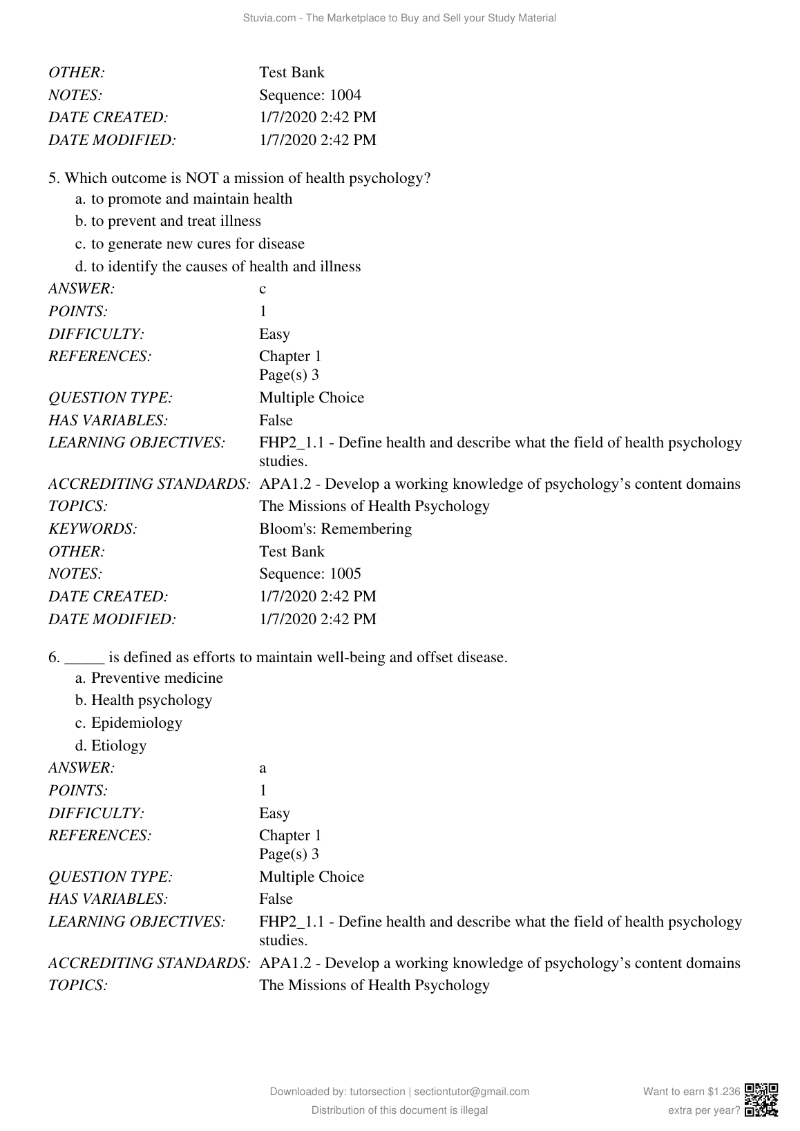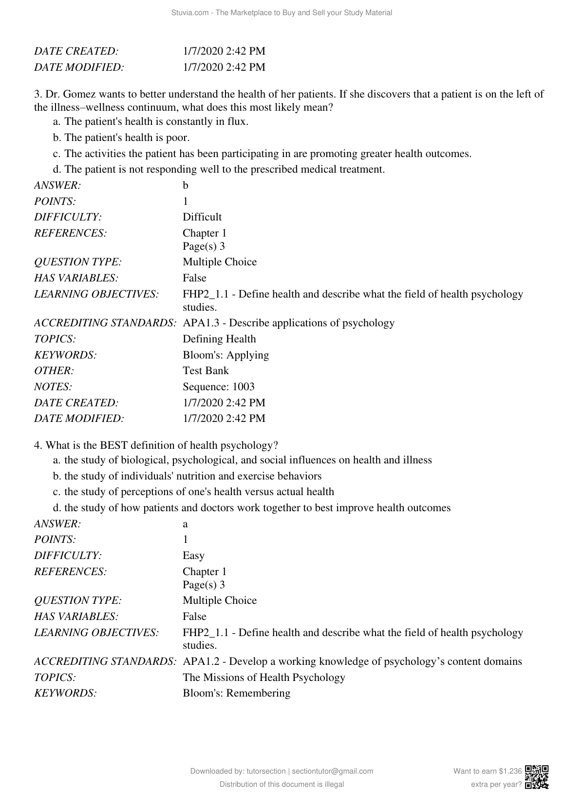 Master your Health Psychology course with this comprehensive Test Bank for the 2nd Edition of 'Health Psychology' by Frazier, Mac-Farlane, and Ristau. This complete resource includes a vast collection of exam questions and detailed answers spanning all chapters of the textbook. It's the perfect tool for students to test their knowledge, understand complex concepts, and prepare thoroughly for exams. This authentic, instructor-approved test bank provides everything you need to study effectively and achieve top grades.