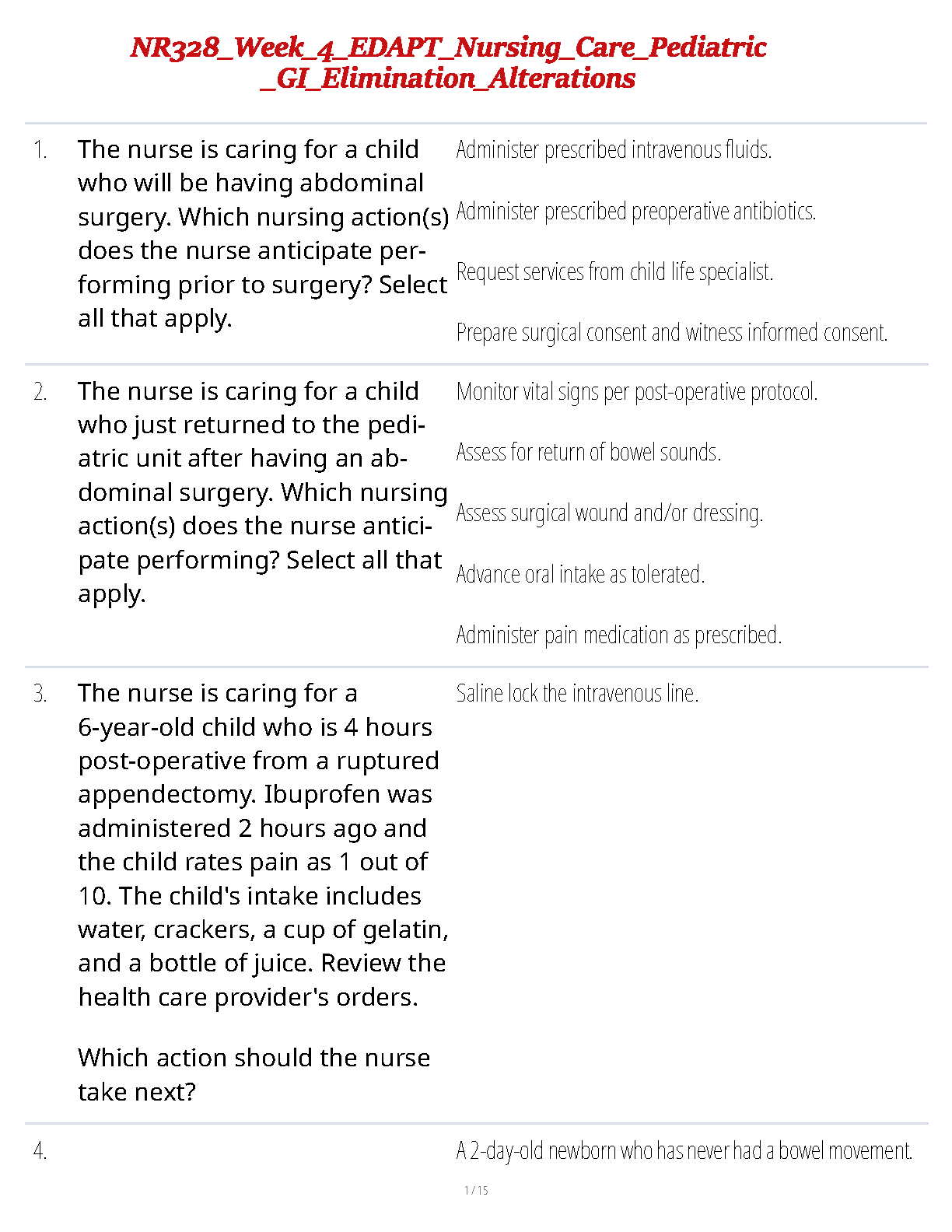 Get ready to excel in your NR328 course with our comprehensive Week 4 EDAPT Test Bank, fully updated for the 2025/2026 academic year. This essential study guide focuses specifically on Nursing Care for Pediatric GI Elimination Alterations. It features a detailed collection of practice questions and verified answers that cover critical topics such as pre- and post-operative care for abdominal surgery, appendectomy management, and key nursing interventions. Designed to mirror the actual exam format, this resource will help you master complex concepts, boost your confidence, and pass your exam on the first try. Stop worrying about resits and start studying smarter with our targeted NR328 exam preparation tool.