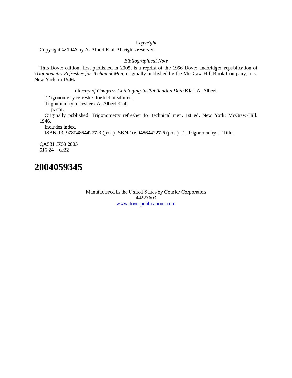 Unlock your full potential in mathematics with the latest 2025/2026 edition of 'Trigonometry Refresher' by A. Albert Klaf. This comprehensive guide is expertly structured to help students grasp core concepts and pass their exams on the first attempt, avoiding costly and stressful resits. Using a unique question-and-answer format, this resource simplifies everything from fundamental angles and functions to complex spherical trigonometry. Packed with hundreds of practical problems and detailed explanations, it's the perfect tool for building confidence and achieving top grades in your trigonometry course.