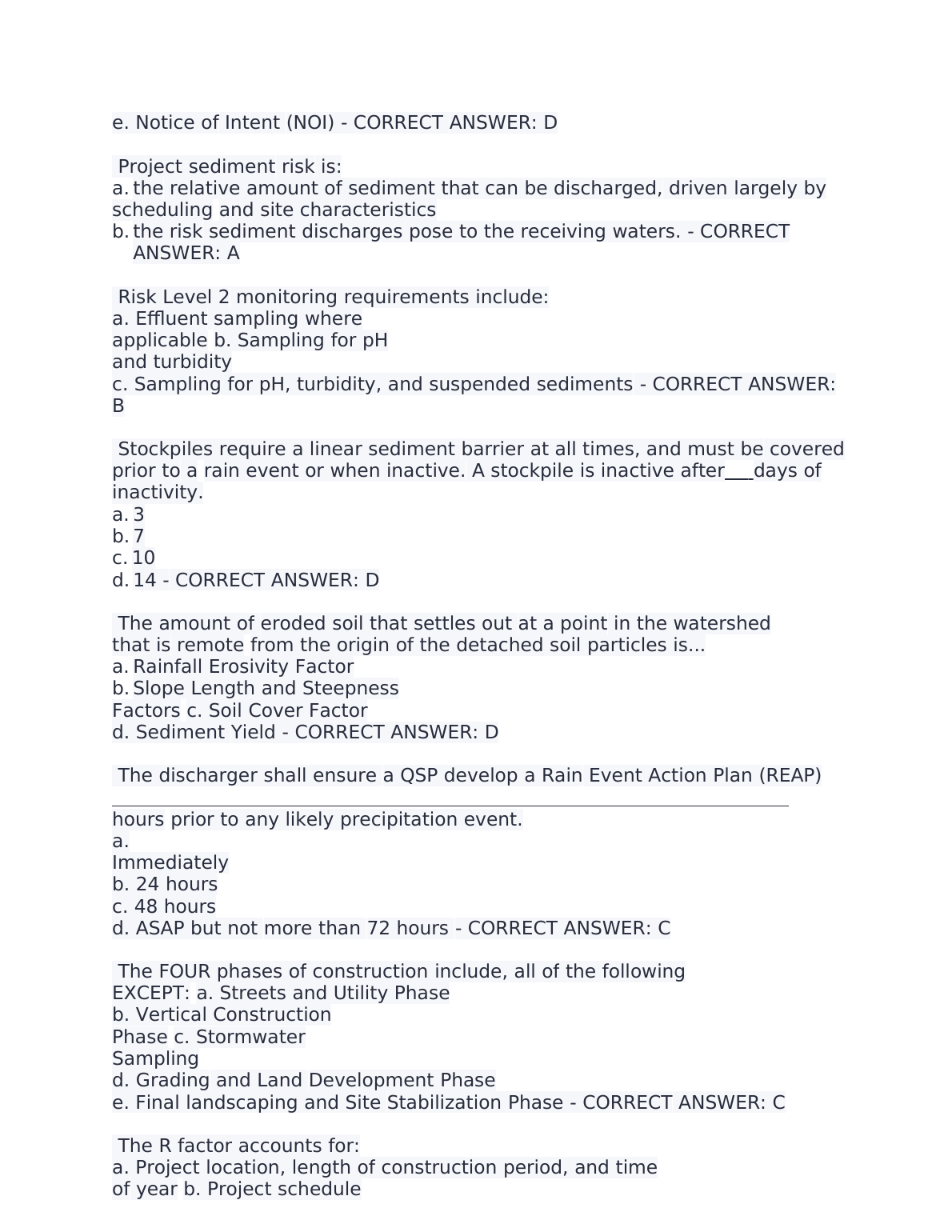Unlock your QSP certification with our comprehensive 2024-2025 test bank! This essential study guide features 125 meticulously curated questions that mirror the actual Qualified SWPPP Practitioner (QSP) exam. Each question comes with a verified, correct answer, ensuring you study the right material and understand key concepts in stormwater management. Designed for aspiring environmental and construction professionals, this resource covers all critical topics from Best Management Practices (BMPs) to SMARTS reporting. Stop worrying about resits and gain the confidence to pass on your first attempt. Download now and fast-track your career!