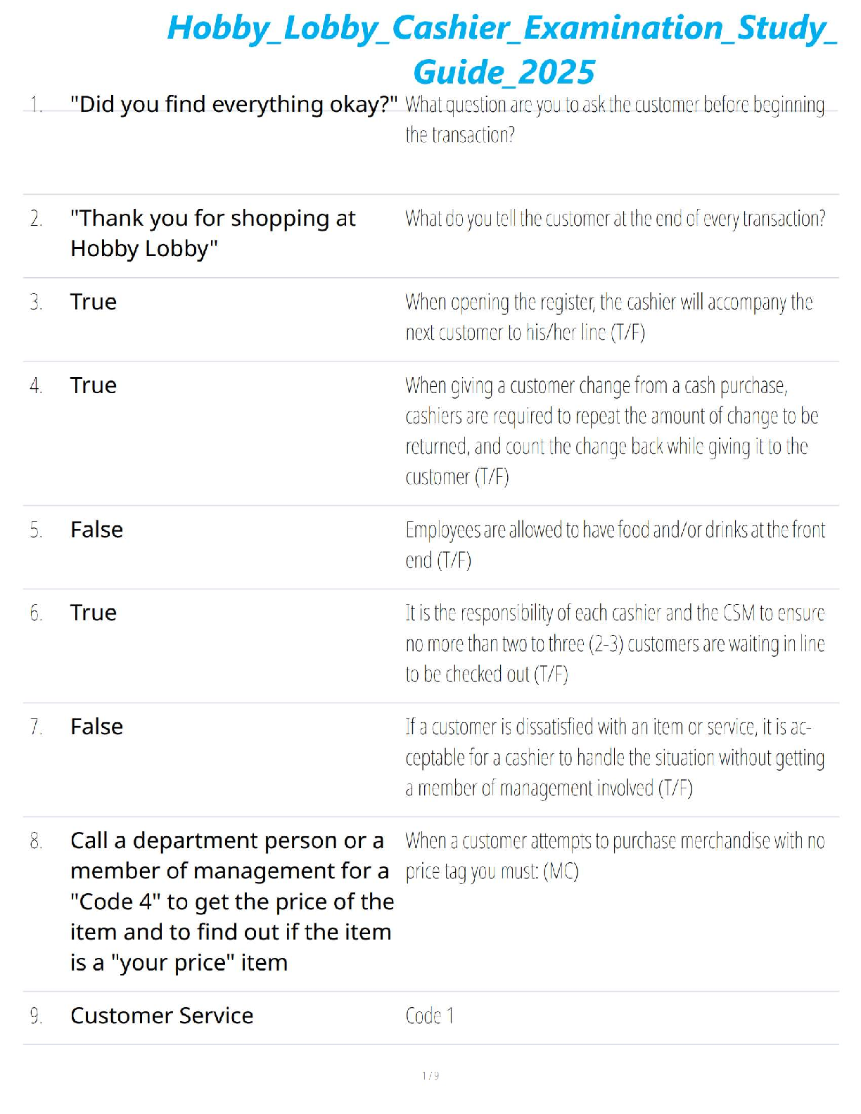 Prepare to ace your job assessment with the most up-to-date study guide for the Hobby Lobby Cashier Examination, 2025 Edition. This comprehensive test bank features a complete collection of potential exam questions and their verified answers, covering essential topics such as customer service protocols, transaction procedures, cash handling, and store-specific codes. This resource is expertly crafted to help you pass on your first attempt, ensuring you are fully prepared to step into your new role at Hobby Lobby with confidence.