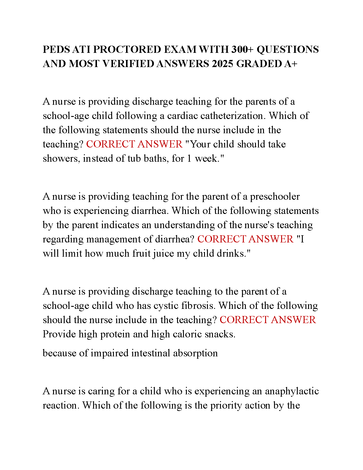 Ace your PEDS ATI Proctored Exam with our comprehensive 2025/2026 study guide. This essential test bank features over 300 meticulously compiled questions, complete with verified and detailed answers, to ensure you master core pediatric nursing concepts. Designed to help you achieve an A+ grade, this resource is your key to avoiding resits and passing with confidence on your first attempt. Get the ultimate preparation tool for your nursing exams today!
