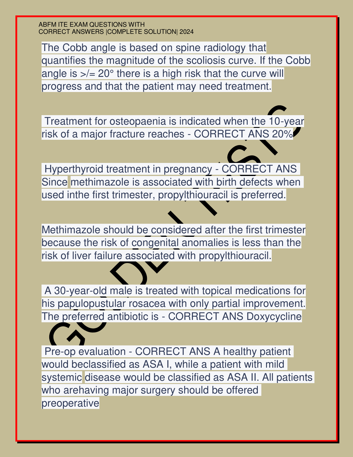 Master the 2024 American Board of Family Medicine (ABFM) In-Training Examination (ITE) with our comprehensive test bank, featuring a complete set of exam questions with verified, accurate answers and solutions. This essential study guide covers a wide range of critical family medicine topics, including musculoskeletal assessments like the Cobb angle for scoliosis, endocrinology challenges such as hyperthyroidism in pregnancy, and pre-operative evaluations. Designed to mirror the actual exam format, this solution manual is your ultimate tool for effective preparation, helping you build confidence and ensure success on your ABFM ITE.