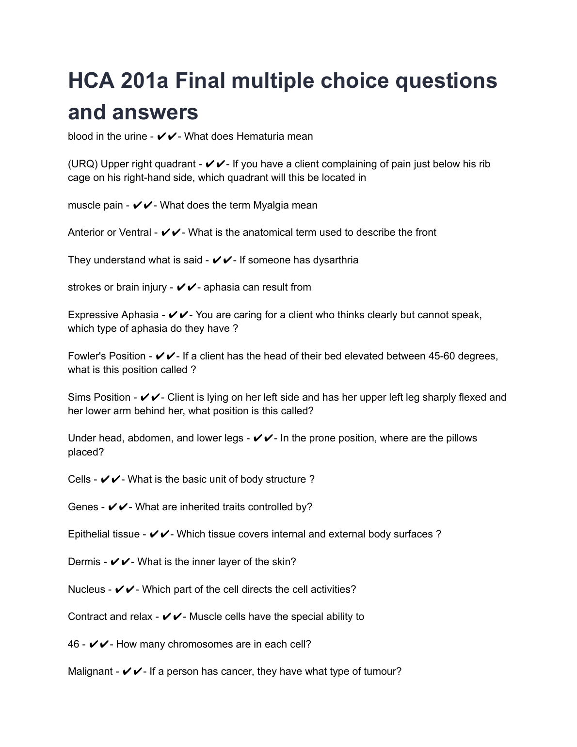 Unlock success in your HCA 201a course with our ultimate Final Exam guide for the 2025/2026 academic year. This comprehensive resource features a detailed compilation of multiple-choice questions and their verified answers, covering essential topics such as medical terminology (Hematuria, Myalgia), patient positioning, basic anatomy, and cell biology. Designed to streamline your study process, this guide is your key to understanding core concepts and passing your final exam with confidence on the first attempt. Avoid the stress of resits and secure your grade today!