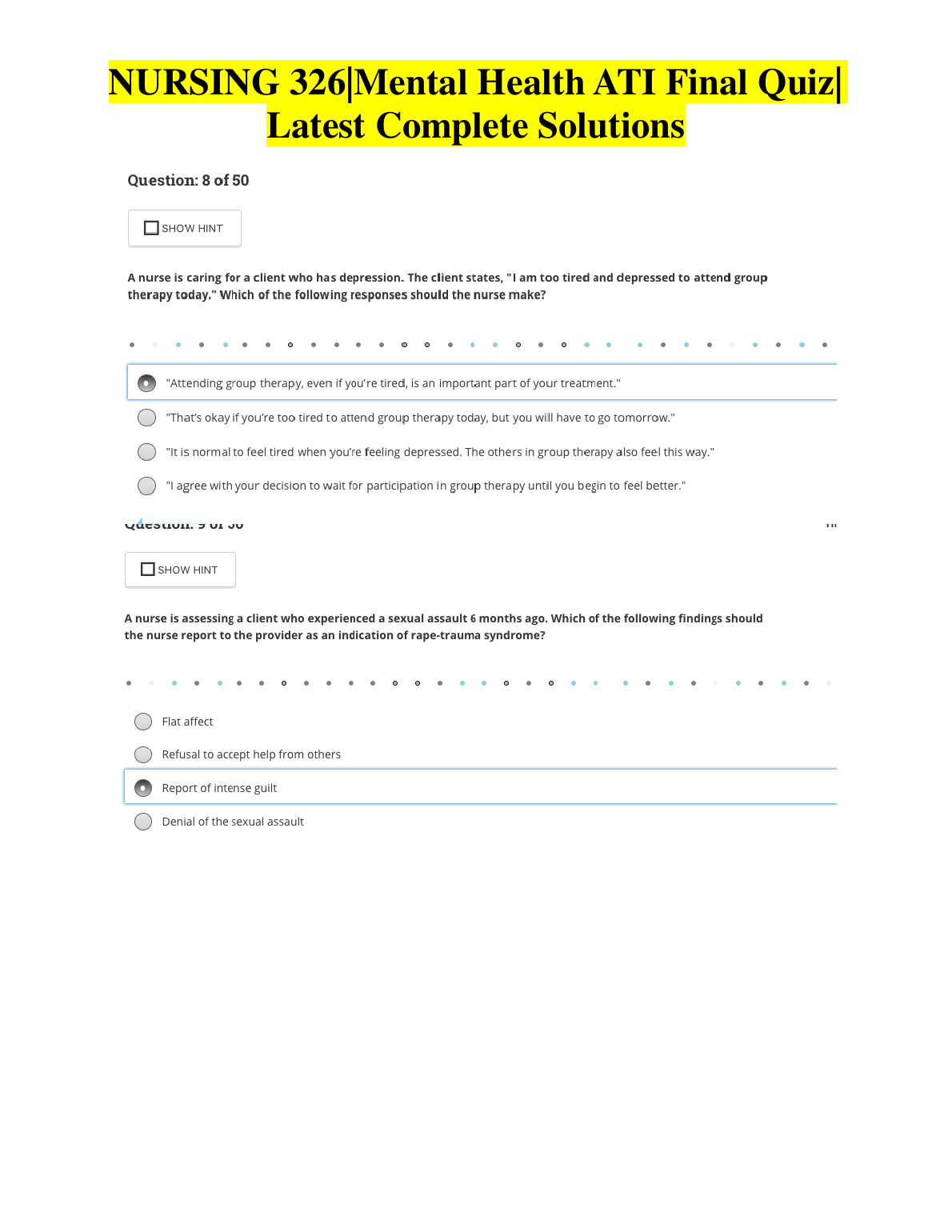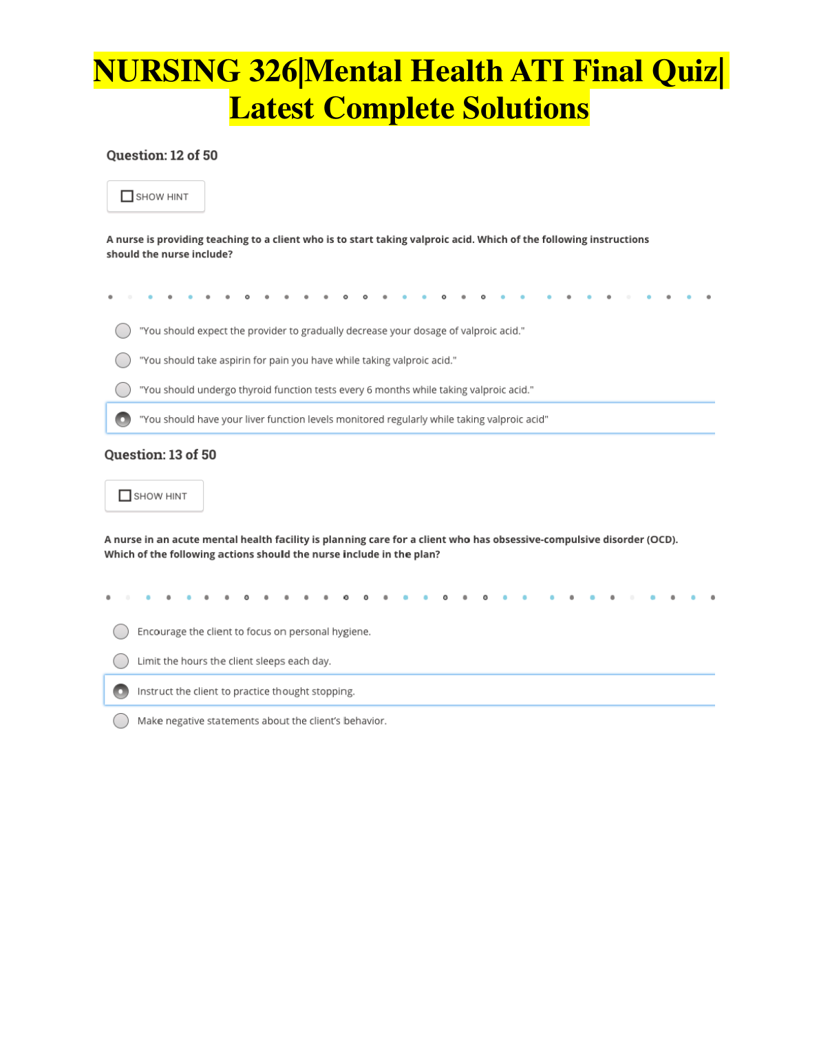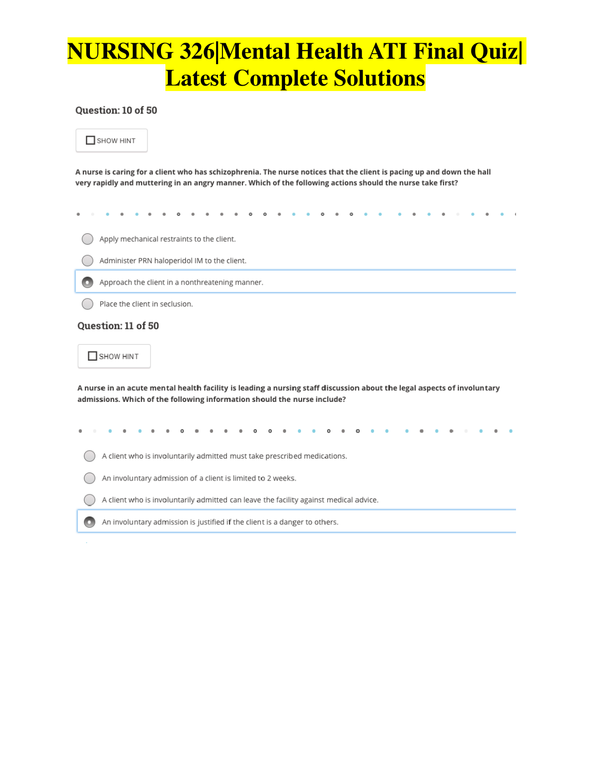 NURSING 326 Mental Health ATI Final Quiz: Verified Questions and Answers Study Guide 2024/2025