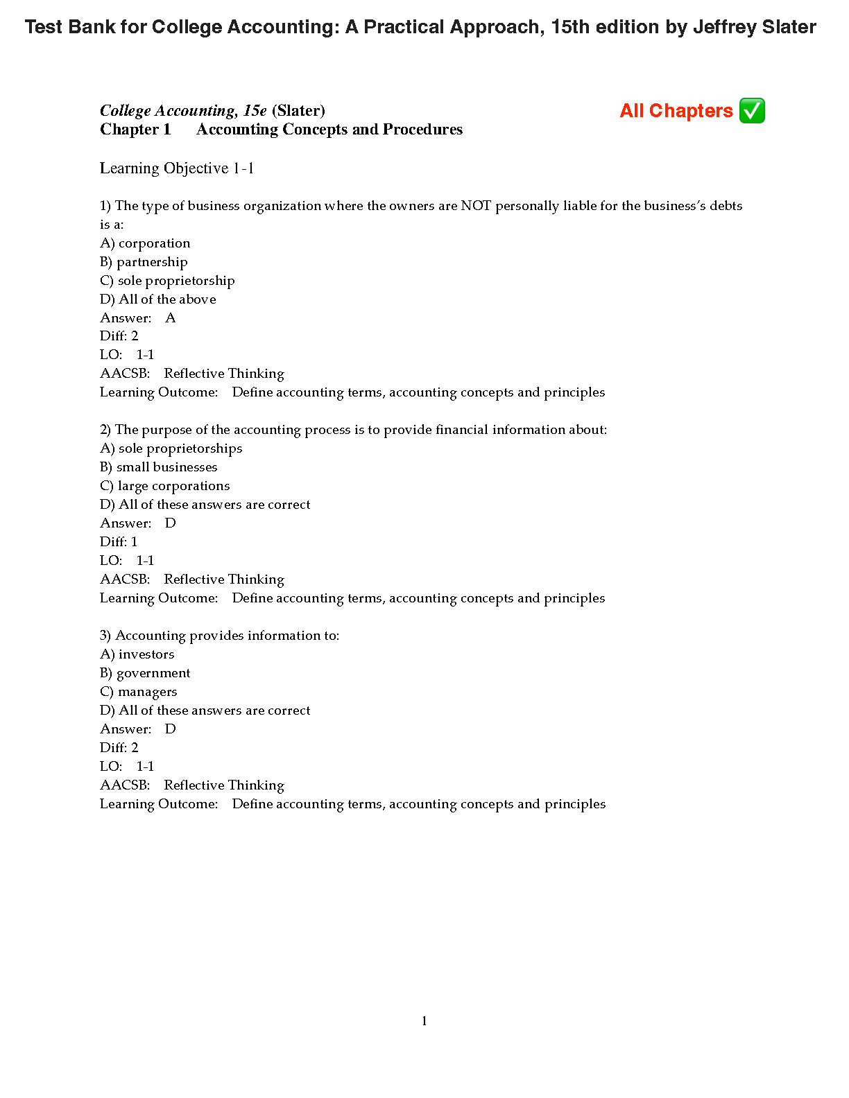 Unlock your full potential in accounting with the complete Test Bank for 'College Accounting: A Practical Approach,' 15th Edition, by Jeffrey Slater and Mike Deschamps. This essential study resource provides a comprehensive collection of exam-style questions and verified answers covering every chapter of the textbook. Master key concepts, practice for your exams with confidence, and gain the insights needed to pass on your first attempt. Ideal for students seeking to ace their accounting course and build a solid foundation for their future careers.