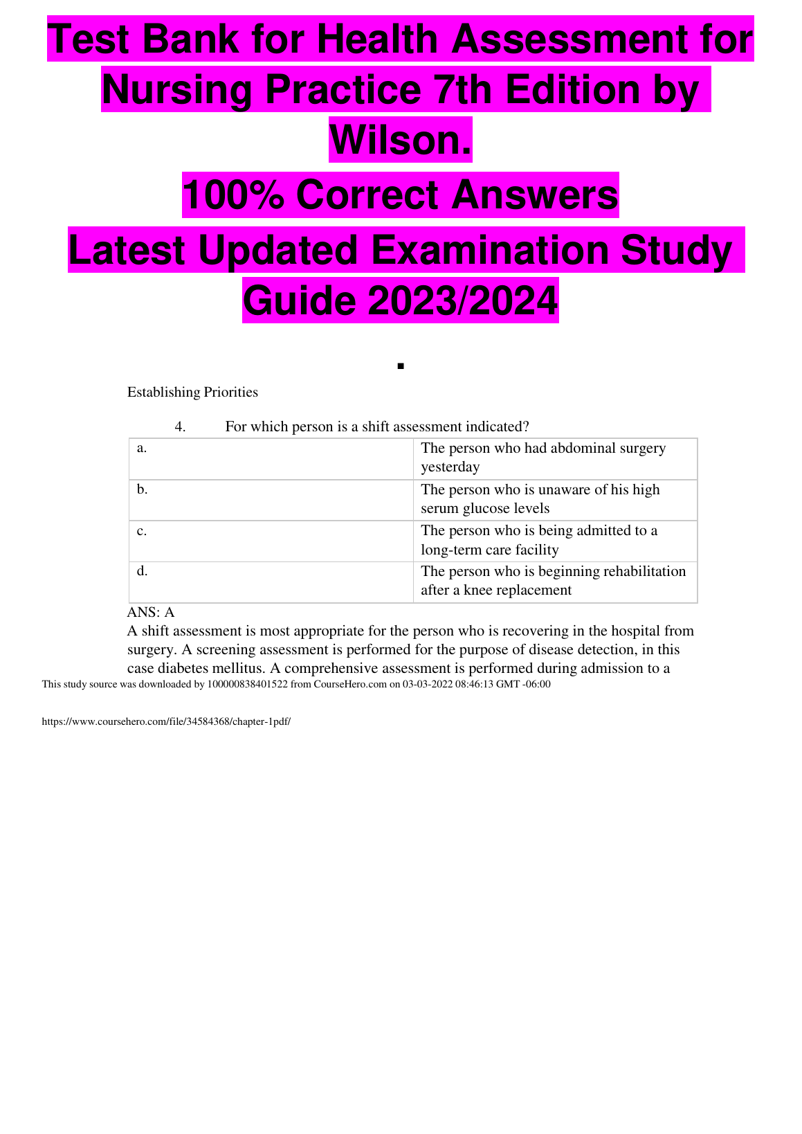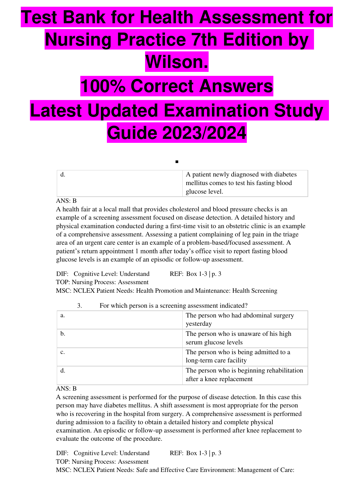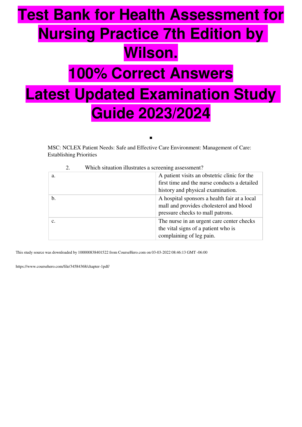Master your nursing course with this official Test Bank for 'Health Assessment for Nursing Practice,' 7th Edition, by Wilson and Giddens. This comprehensive study guide features a complete collection of practice questions and verified answers, mirroring the format of your actual exams. It's an essential tool to deepen your understanding, build confidence, and ensure you achieve top grades in your health assessment studies.