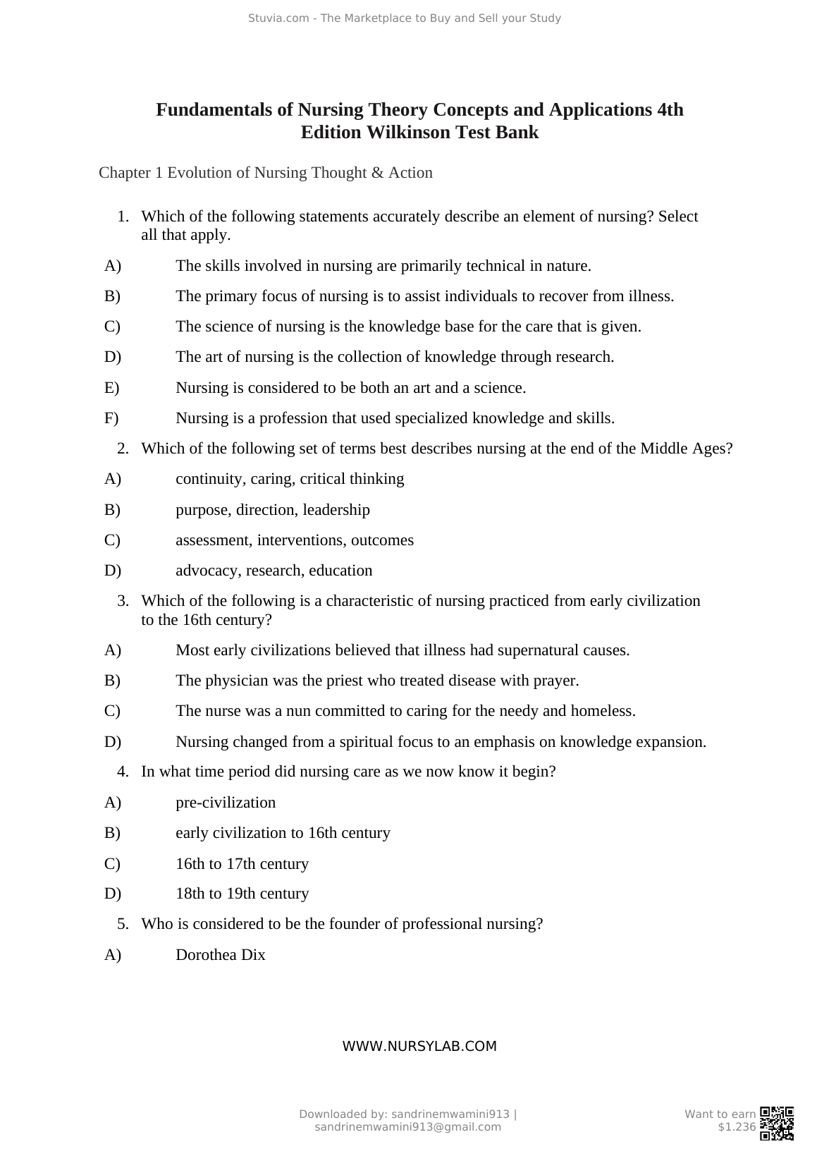 Test Bank for Fundamentals of Nursing: Theory, Concepts, and Applications, 4th Edition by Judith M. Wilkinson, Leslie S. Treas, Karen L. Barnett, & Mable H. Smith