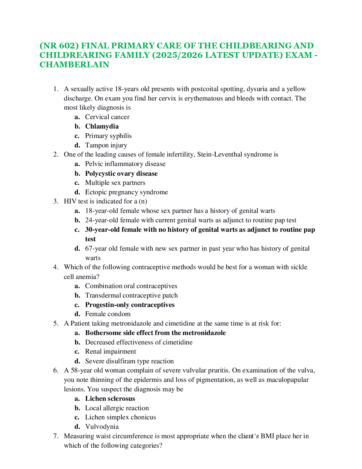 Ace your NR 602 Final Exam at Chamberlain University with our latest 2025/2026 study guide. This comprehensive resource covers all essential topics for Primary Care of the Childbearing and Childrearing Family, featuring a full set of exam questions with verified, expert-checked answers. Designed to help you master key concepts in women's health and gynecology, this guide is your ultimate tool to study efficiently, build confidence, and pass your exam on the first try. Avoid resits and secure your grade with this up-to-date material.