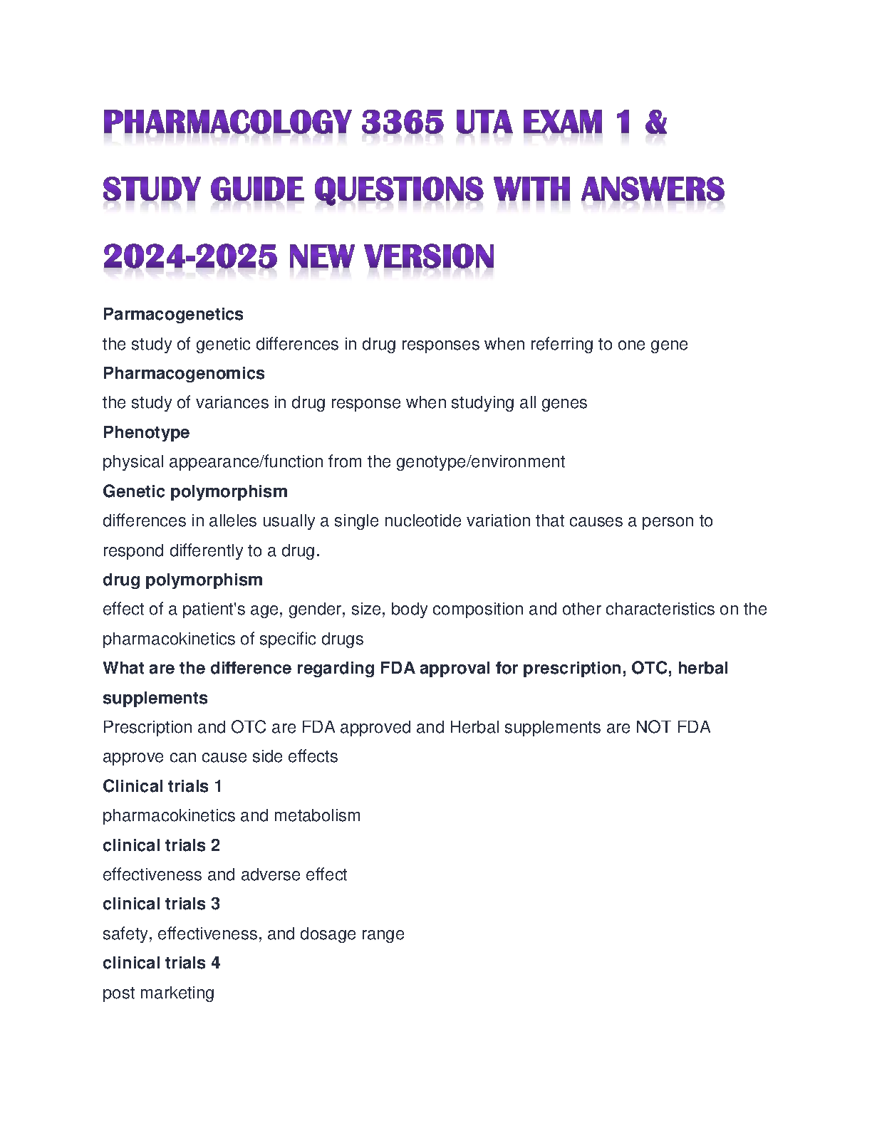 Ace your Pharmacology 3365 Exam 1 at UTA with our comprehensive Test Bank and Study Guide for the 2025/2026 academic year. This is not just a list of questions; it's your ultimate resource for success, featuring a complete set of exam-focused questions and detailed, verified answers. Master crucial topics such as pharmacogenetics, pharmacogenomics, clinical trial phases, drug polymorphism, and FDA regulations. Designed to help you study smarter, not harder, this guide is your key to passing the exam on your first attempt and avoiding resits. Download now and secure your top grade!