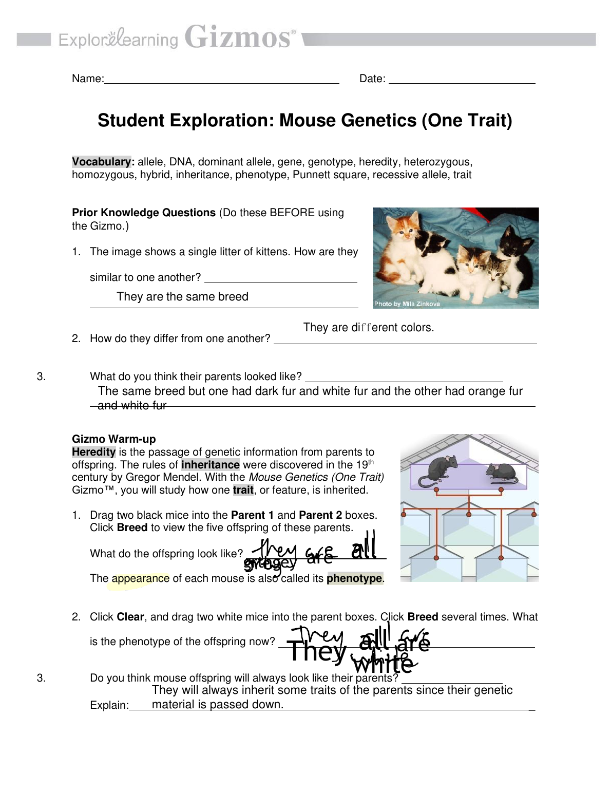 Mouse Genetics (One Trait) Gizmo Answer Key by ExploreLearning | Student Exploration Sheet Solved