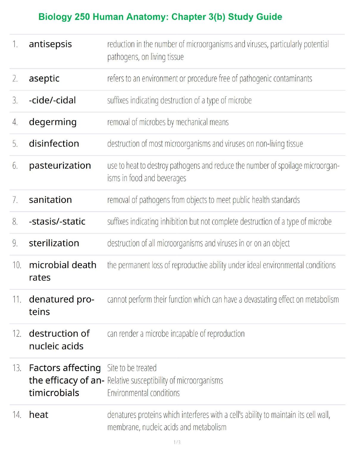 Unlock your potential in Biology 250 Human Anatomy with this comprehensive study guide for Chapter 3(b), updated for the 2025/2026 academic year. This guide provides clear, concise definitions for essential terminology related to the control of microbial growth, including antisepsis, disinfection, sterilization, and pasteurization. Understand the key differences between '-cidal' and '-static' agents, the mechanics of degerming, and the factors that influence antimicrobial effectiveness. This resource is expertly designed to streamline your study process, solidify your understanding of crucial concepts, and equip you to pass your exams confidently on the first attempt, eliminating the need for resits.
