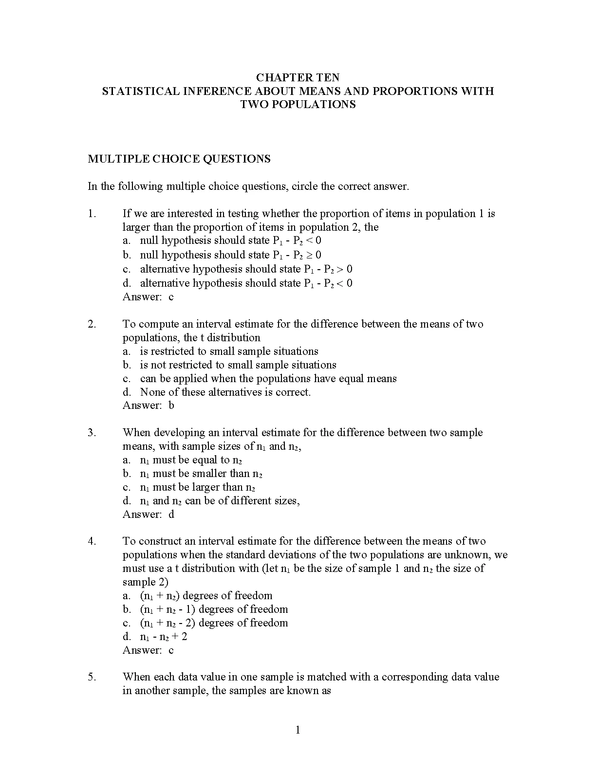 TEST BANK FOR ECON (CHAPTER TEN STATISTICAL INFERENCE ABOUT MEANS AND PROPORTIONS WITH TWO POPULATIONS)