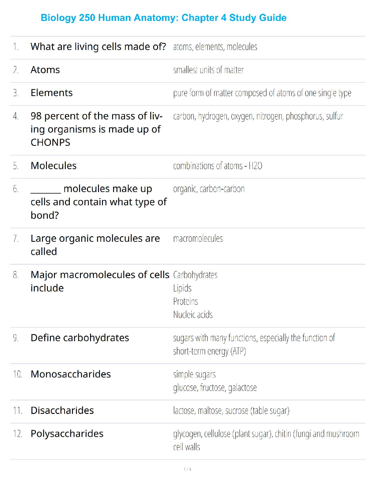 Unlock success in your Biology 250 Human Anatomy course with this comprehensive Chapter 4 study guide, fully updated for the 2025/2026 academic year. This essential resource breaks down the complex chemical level of organization into an easy-to-digest Q&A format. Master key concepts like atoms, elements, CHONPS, and the major macromolecules—carbohydrates, lipids, proteins, and nucleic acids. Aligned with leading textbooks like Marieb & Wilhelm's 9th Edition, this guide is expertly crafted to help you grasp the fundamentals, ace your exams on the first try, and build a solid foundation for your anatomy studies. Say goodbye to exam anxiety and avoid costly resits with this ultimate study companion!
