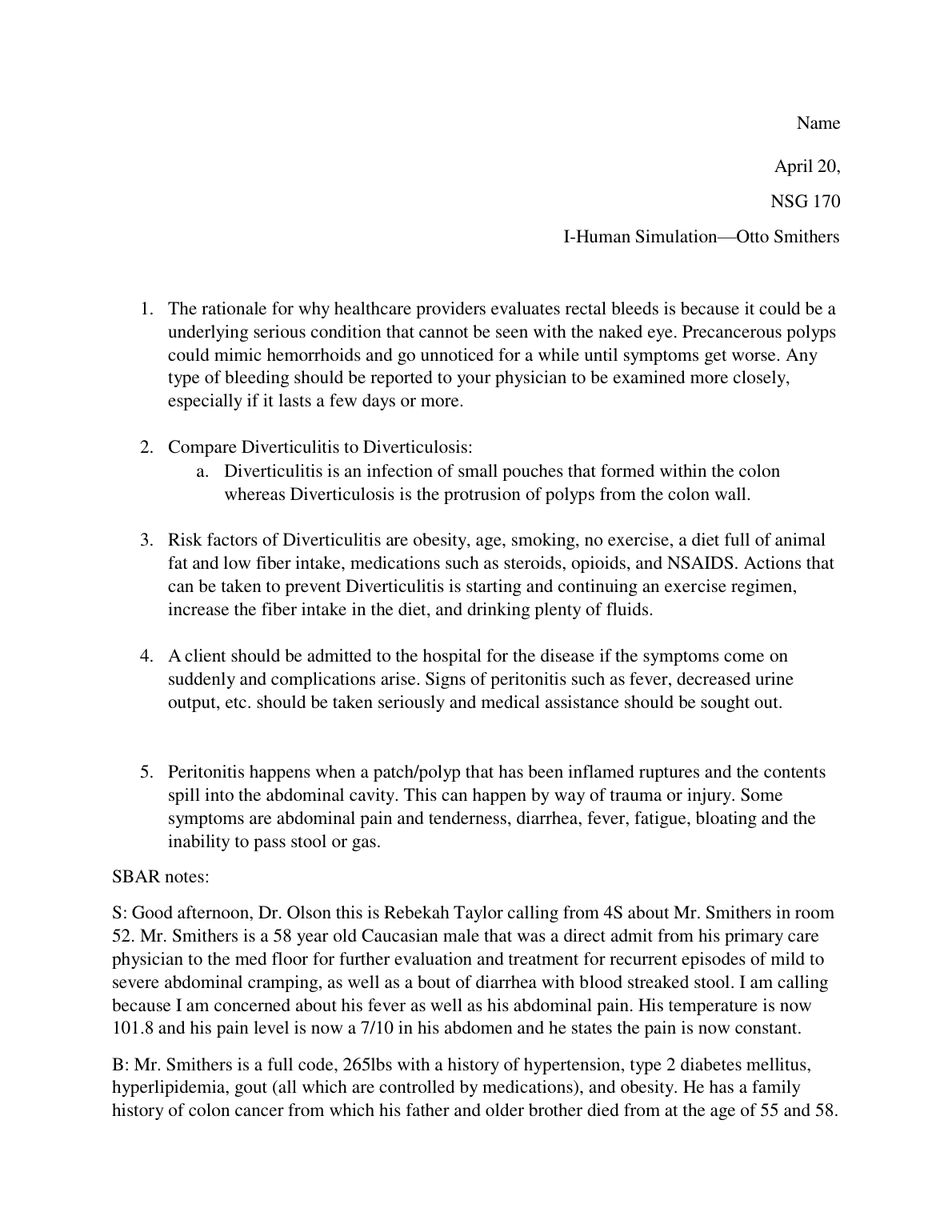 NSG 170 i-Human Otto Smithers Case Study on Diverticulitis: Complete Guide | Latest 2025/2026 Edition to Pass Exams First Time