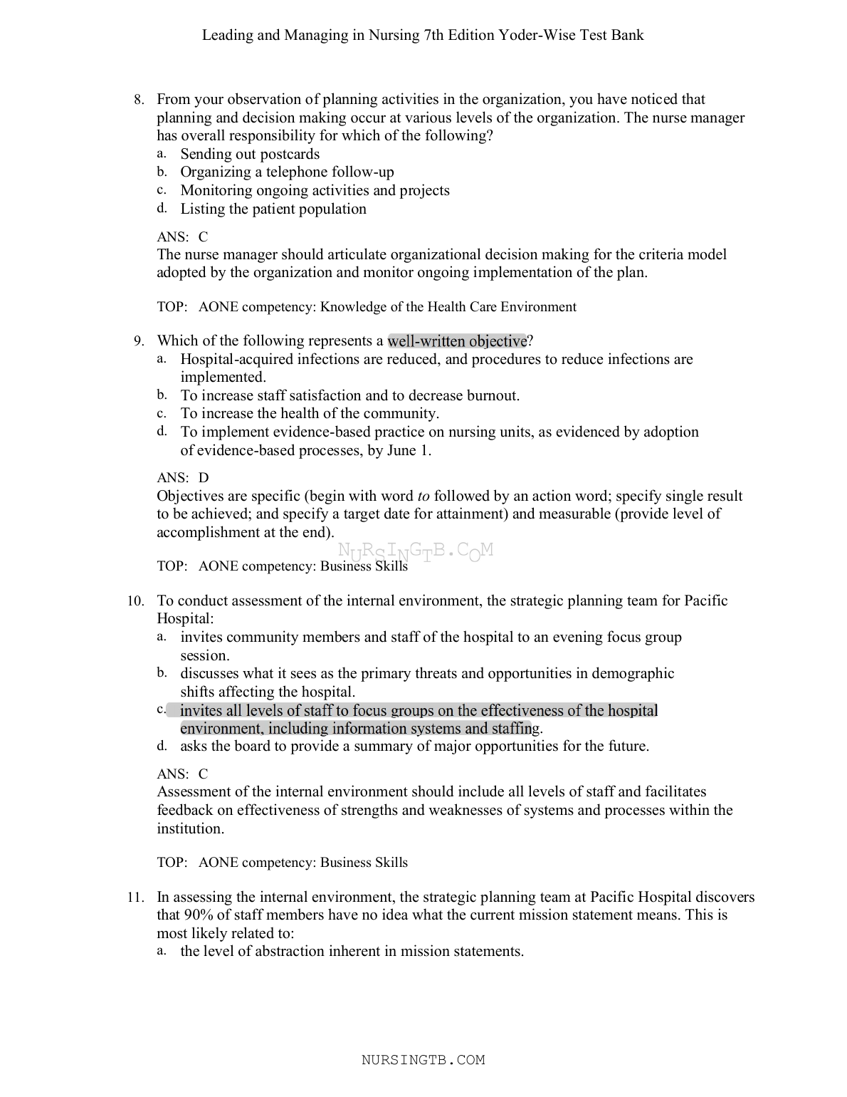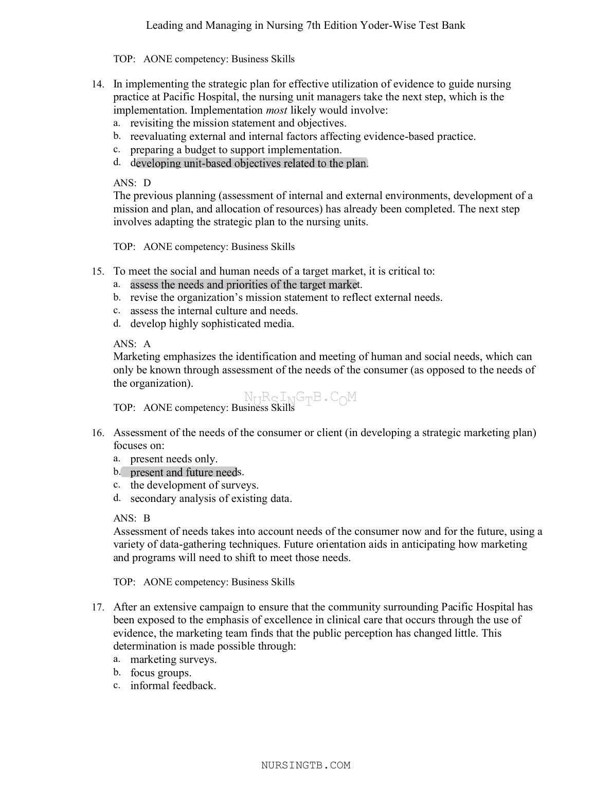 Achieve academic excellence with the official Test Bank for 'Leading and Managing in Nursing, 7th Edition'. Authored by Yoder-Wise, Sportsman, and Batten, this comprehensive resource provides a vast collection of exam-style questions, complete with correct answers and detailed rationales for every chapter. It's expertly designed to deepen your understanding of nursing leadership concepts, sharpen your critical-thinking skills, and fully prepare you to ace your exams. Stop memorizing and start understanding—this test bank is your key to mastering the material and succeeding in your nursing course.