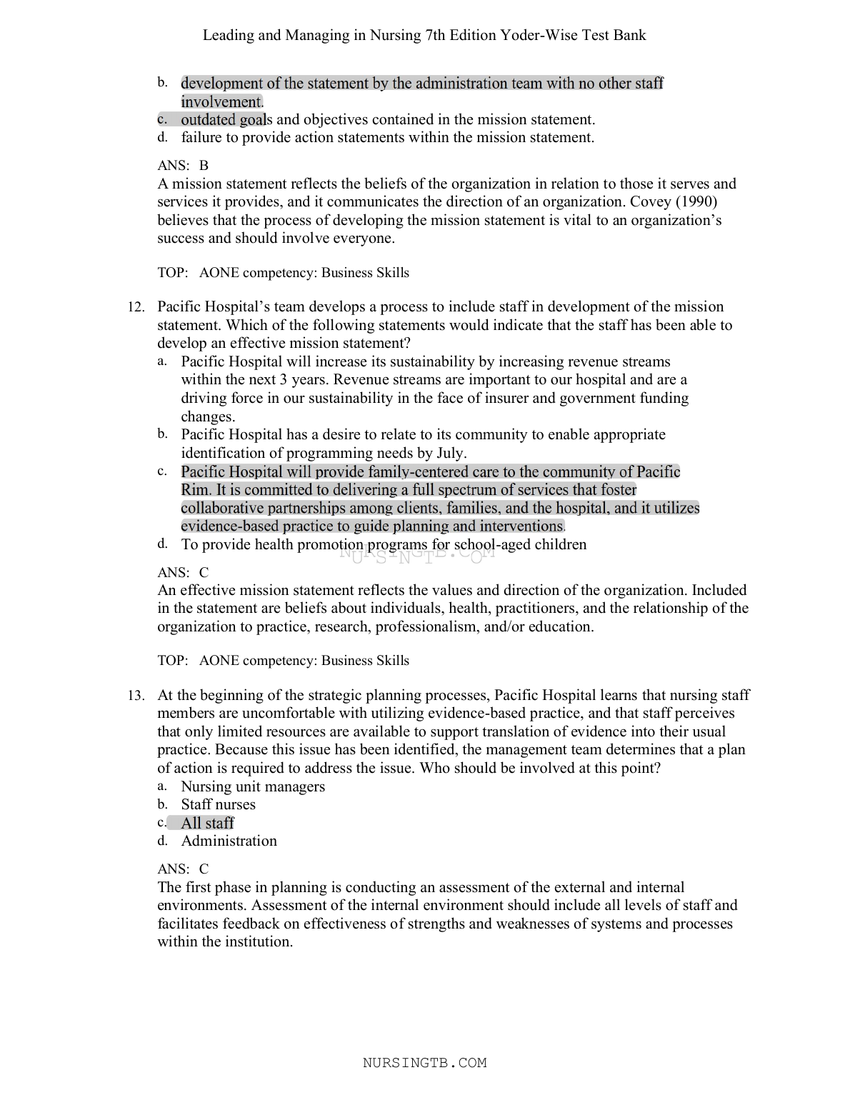 Test Bank for Leading and Managing in Nursing, 7th Edition by Patricia S. Yoder-Wise, Susan Sportsman, and Jeanette T. Batten