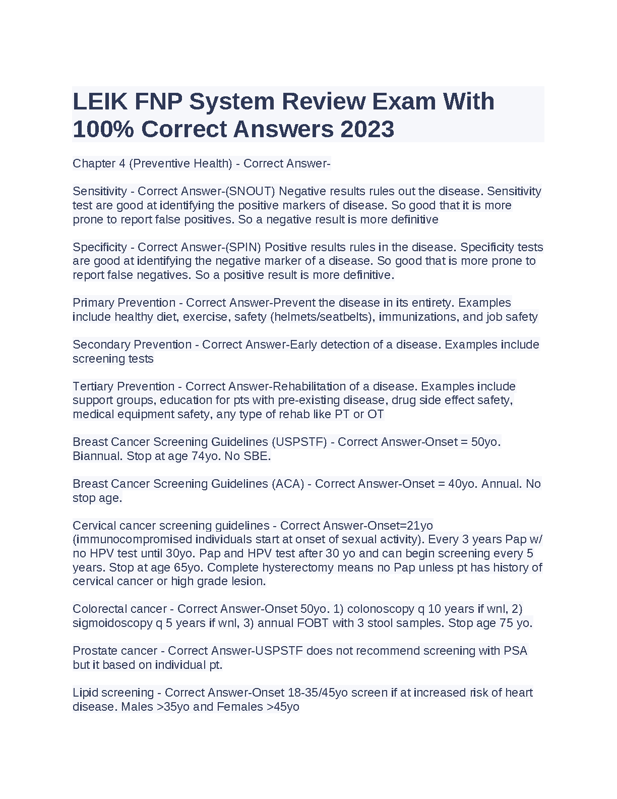 Unlock success on your FNP certification exam with this comprehensive test bank for Chapter 4 (Preventive Health) from Maria T. Codina Leik's 4th Edition Family Nurse Practitioner Certification Intensive Review. This essential study guide provides 100% correct and verified answers to crucial exam topics, including sensitivity (SNOUT) and specificity (SPIN), primary, secondary, and tertiary prevention strategies, and up-to-date screening guidelines for breast, cervical, colorectal, and prostate cancer, as well as lipid screening. Master these fundamental concepts and boost your confidence for exam day. This resource is designed to help you pass your FNP boards on the first try.