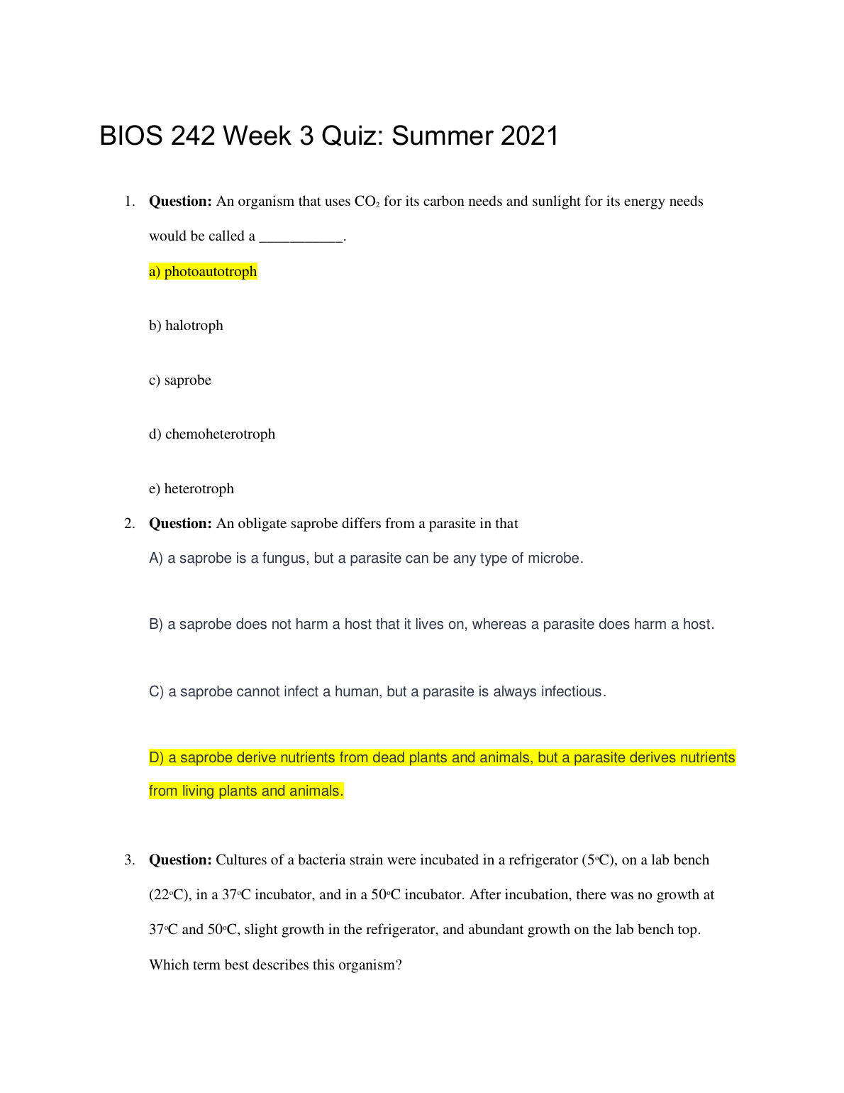 Ace your BIOS 242 Microbiology course with this comprehensive test bank for the Week 3 Quiz. This resource provides detailed questions and 100% verified correct answers, covering key topics such as microbial metabolism (photoautotrophs), ecological roles (saprobes vs. parasites), and bacterial growth requirements. Perfect for exam preparation, this study guide is designed to help you master the material, boost your grades, and pass your exams with confidence.