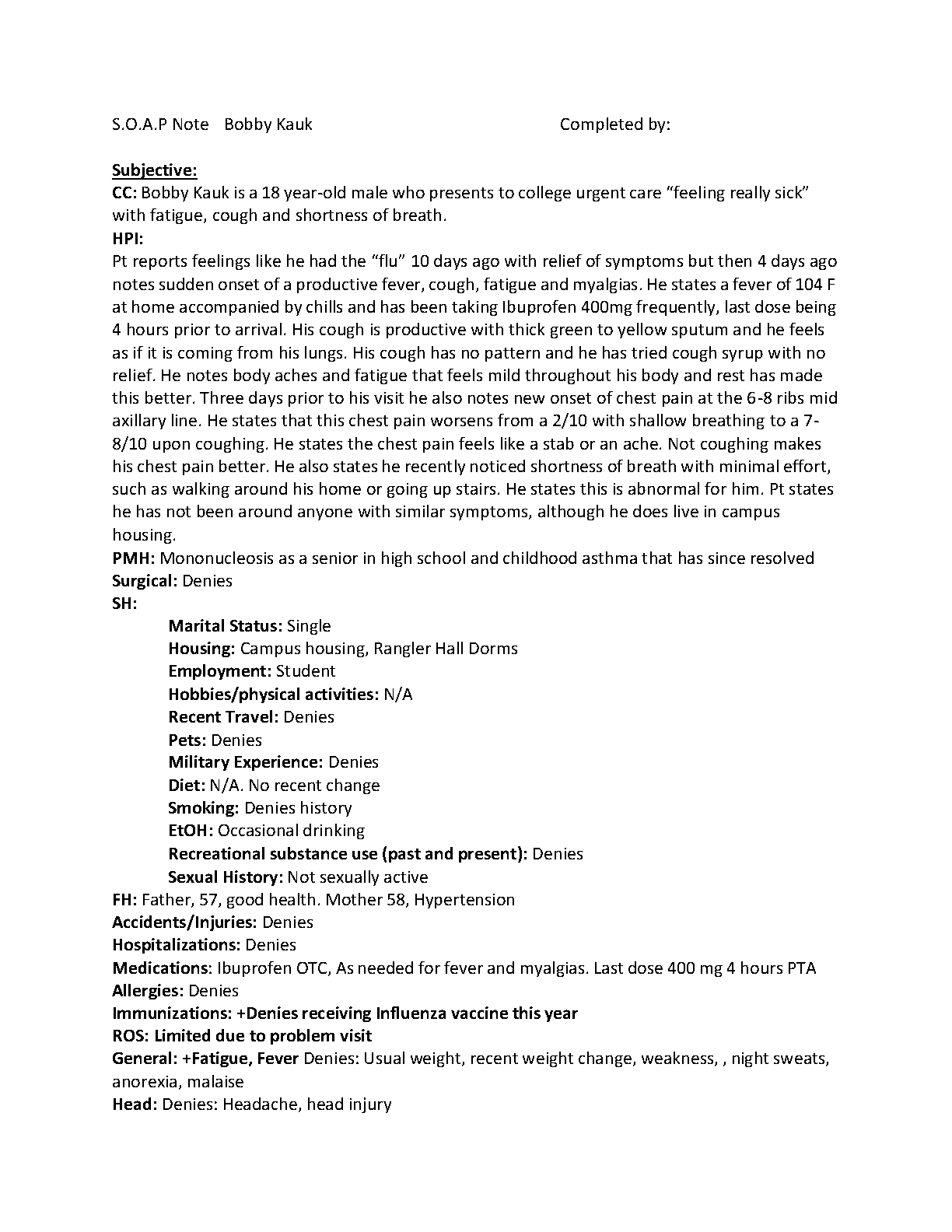 Master the iHuman Bobby Kauk case study with our comprehensive and updated 2025/2026 S.O.A.P. note. This essential study aid details the subjective findings for an 18-year-old male student presenting with symptoms of a severe respiratory infection, including productive cough, high fever, and chest pain. Dive deep into the patient's HPI, PMH, and ROS to build your clinical reasoning skills. This guide is your key to understanding the diagnosis (community-acquired pneumonia) and acing your exams on the very first try, helping you avoid costly and stressful resits.
