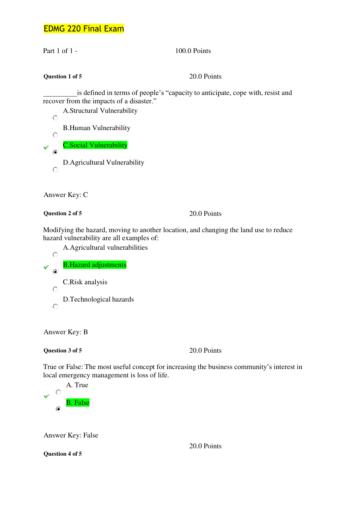 Master your EDMG 220 course and excel in your final exam with our comprehensive test bank. This essential study guide features a full range of exam questions, complete with verified answers, covering critical topics like social vulnerability, hazard adjustments, and emergency management. Our EDMG 220 Final Exam Test Bank is expertly crafted to boost your understanding, build confidence, and ensure you're fully prepared to achieve an outstanding grade. Study smarter, not harder, and pass your exam on the first attempt!