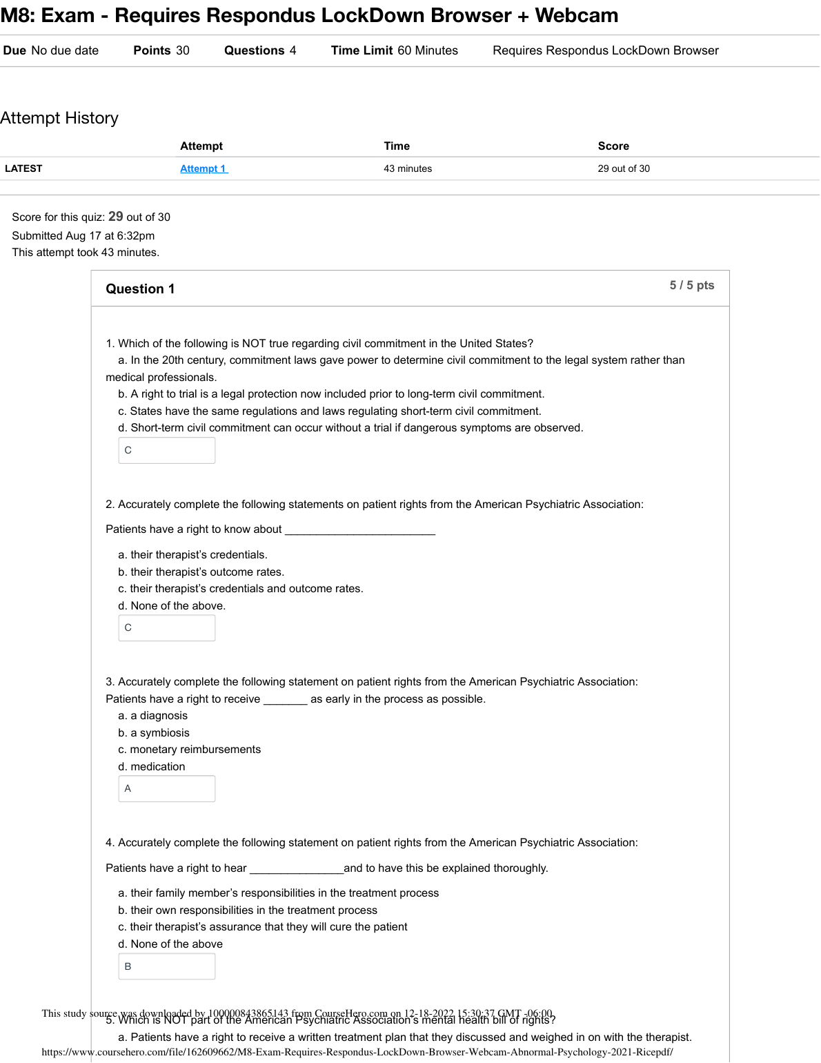 Unlock your full potential in Abnormal Psychology with our comprehensive test bank for the M8 Exam. This expertly curated resource, updated for the 2025-2026 academic year, provides a complete set of questions and verified correct answers, as demonstrated by the high score of 29/30 in the document. This guide covers crucial topics such as U.S. civil commitment laws and the American Psychiatric Association's guidelines on patient rights. It is the ultimate tool for effective exam preparation, designed to help you grasp key concepts, anticipate test questions, and confidently pass your exam on the first attempt, avoiding costly resits.