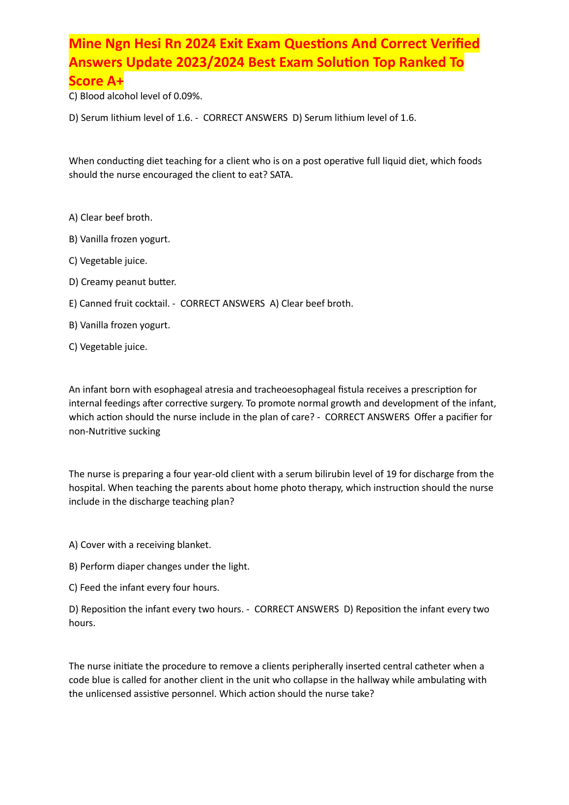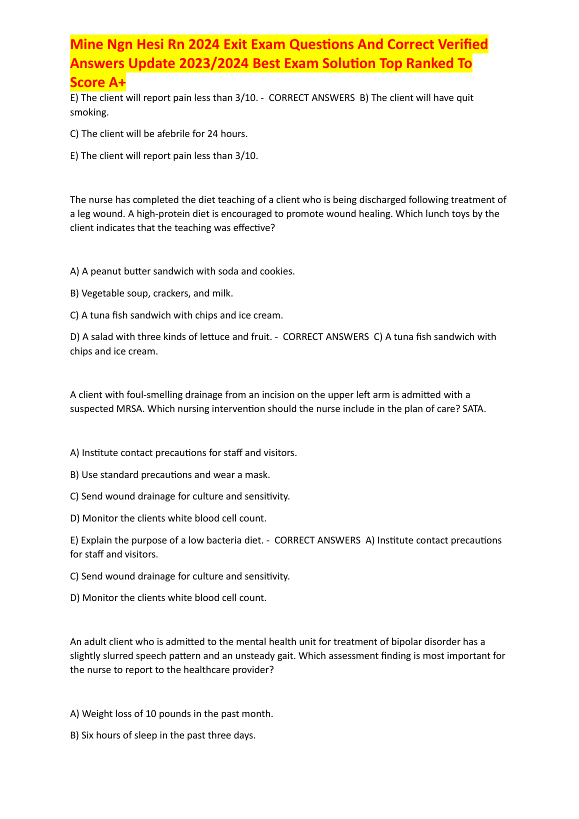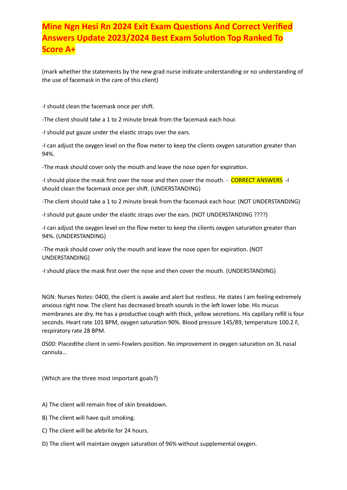 Unlock your potential and ace the 2024 HESI RN Next Generation (NGN) Exit Exam with our premier test bank. This comprehensive resource is meticulously compiled with the most current exam questions and 100% verified, correct answers. Designed to mirror the actual exam, it covers a wide range of critical nursing scenarios, helping you build confidence and master clinical judgment. Study smart, prepare effectively, and secure your A+ score on the first attempt with this top-ranked solution.