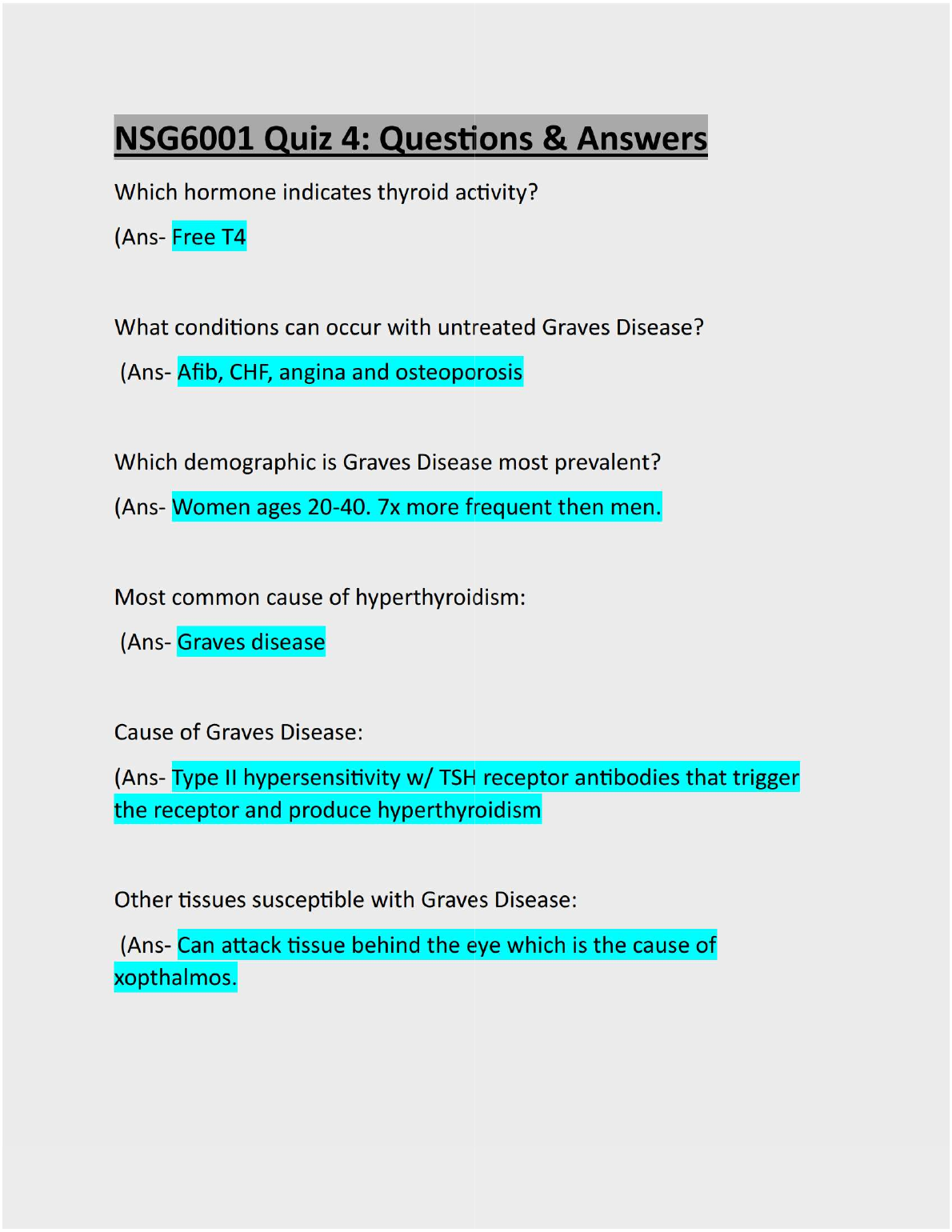 Unlock academic success in your NSG6001 course with our latest 2025/2026 study guide for Quiz 4. This comprehensive resource provides a complete set of questions with expertly verified answers, focusing on critical topics such as thyroid function, Graves' Disease, hyperthyroidism, and associated complications. Designed to help you master the material efficiently and confidently face your exam. Prepare effectively, understand complex concepts with ease, and pass on your first attempt, eliminating the stress of resits. Your essential tool for acing NSG6001 Quiz 4.