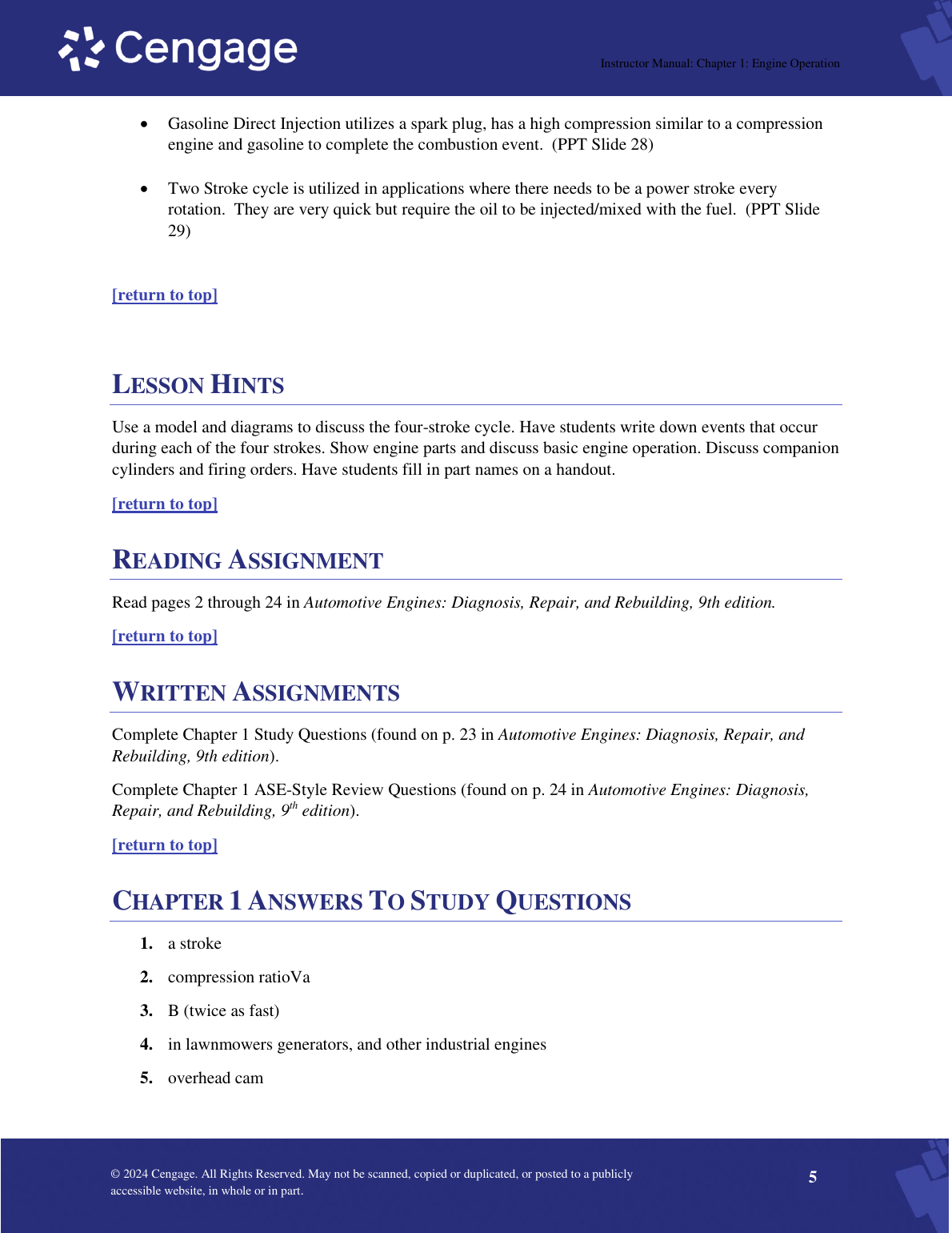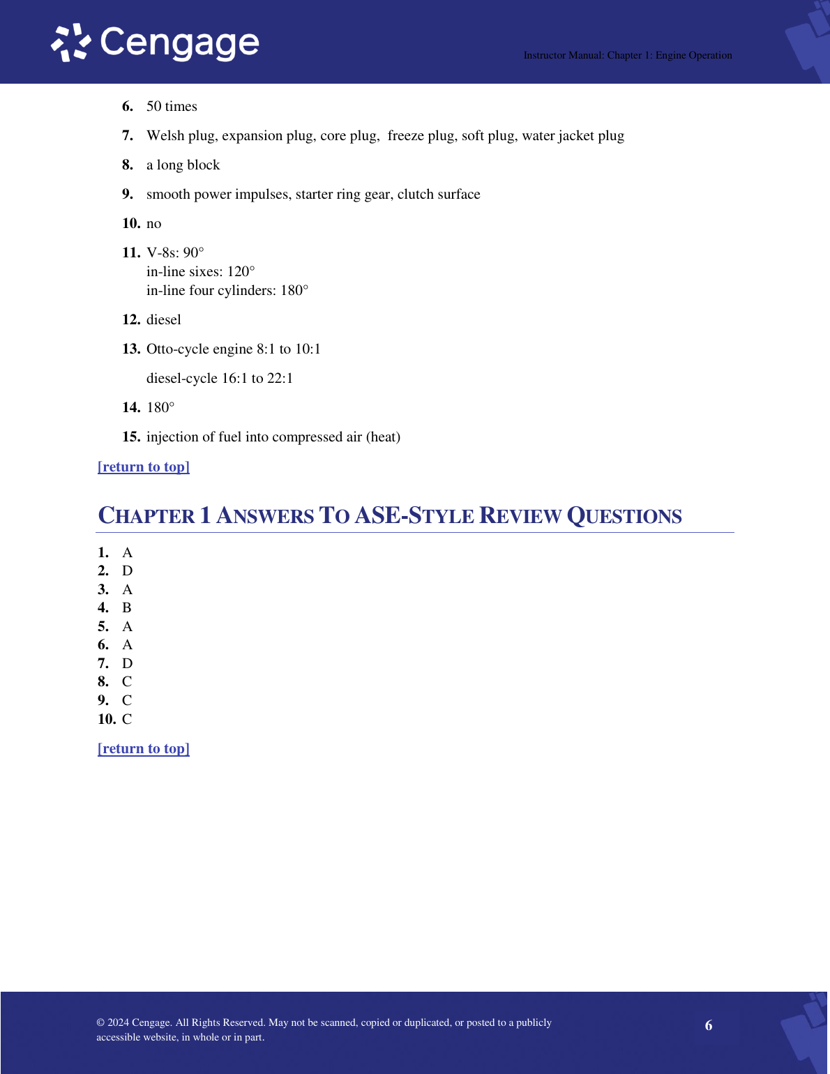Unlock your full potential with the official Solution Manual for 'Automotive Engines: Diagnosis, Repair, and Rebuilding, 9th Edition' by renowned authors Tim Gilles and Tim LeVan. This comprehensive resource provides meticulously detailed, step-by-step solutions for all end-of-chapter study questions and critical ASE-style review questions. It is expertly designed to deepen your understanding of complex engine diagnostics and repair procedures, making it the ultimate tool for exam preparation and practical skill mastery. Instantly download this guide to verify your work, clarify difficult concepts, and confidently prepare for your automotive technology career.
