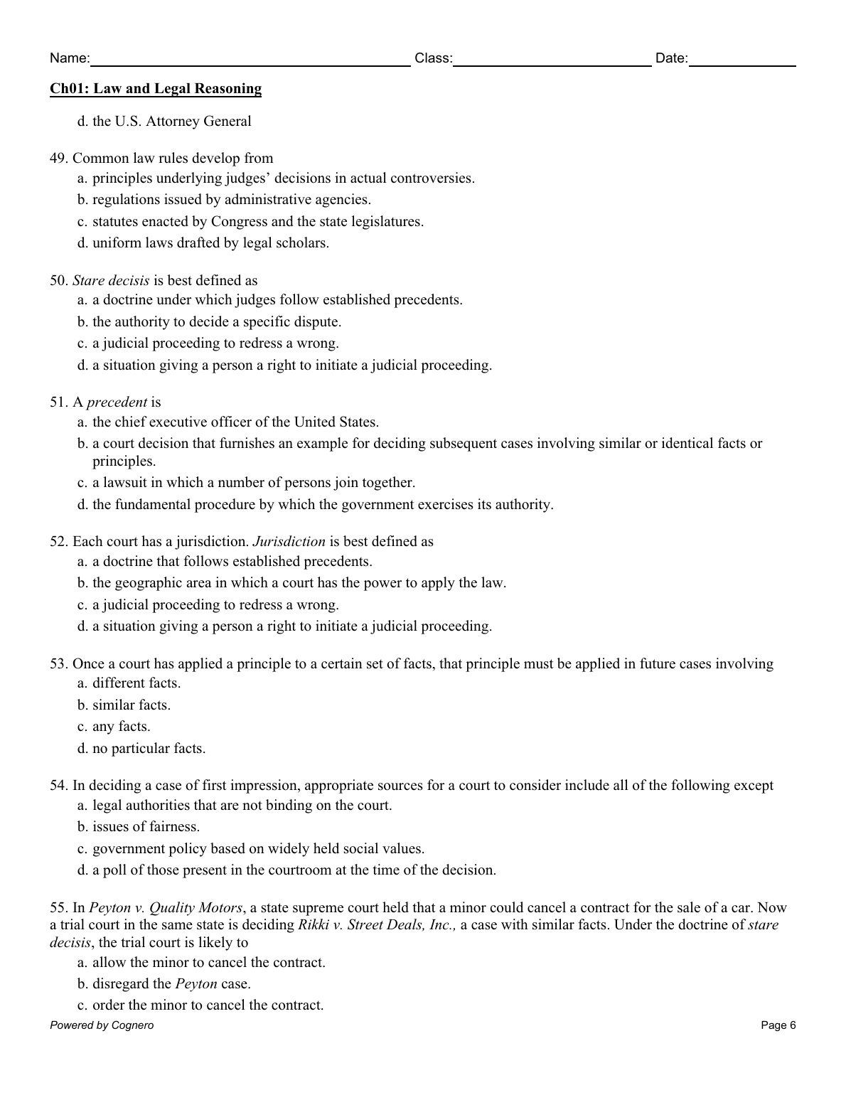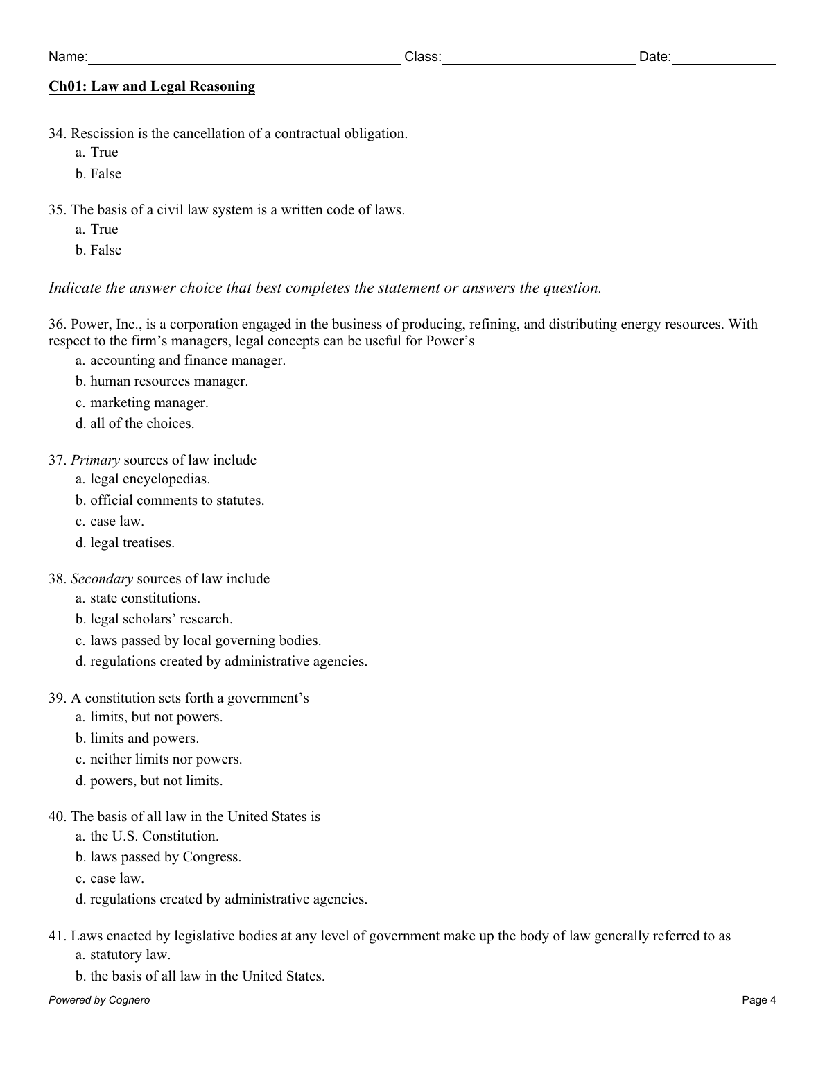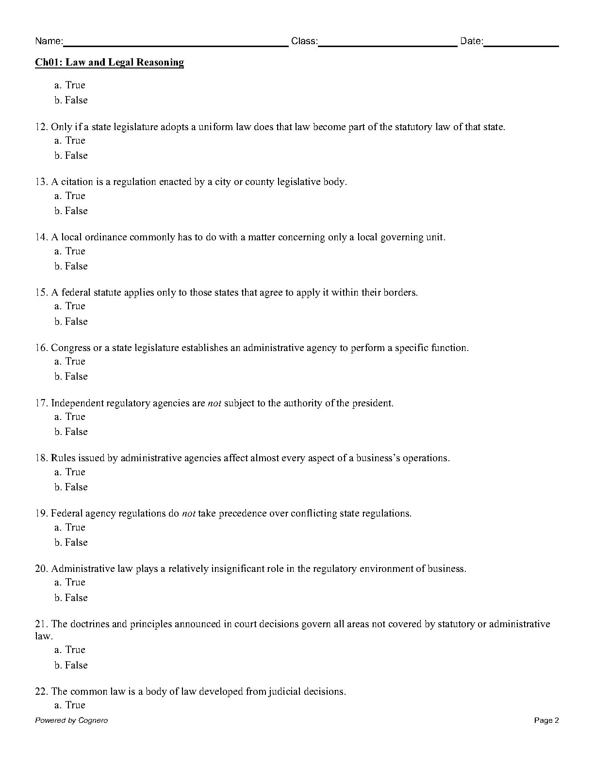 Test Bank for Business Law: Text and Cases, 15th Edition by Kenneth W. Clarkson, Roger LeRoy Miller, and Frank B. Cross - Chapter 1: Law and Legal Reasoning