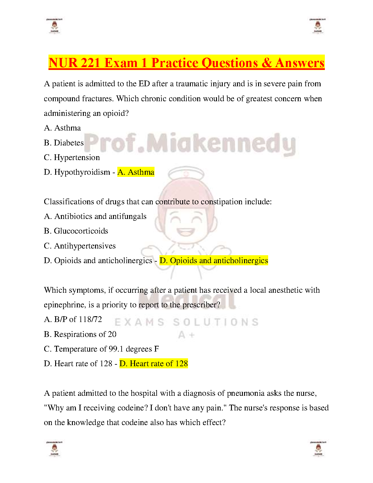 Ace your NUR 221 Exam 1 with this comprehensive test bank! This essential study guide features a collection of practice questions complete with detailed, verified answers, focusing on key pharmacology concepts. Master topics such as opioid administration precautions, drug classifications and side effects, patient assessment priorities, and understanding drug actions. Designed specifically for nursing students, this resource will help you build confidence, test your knowledge, and pass your first exam with flying colors.