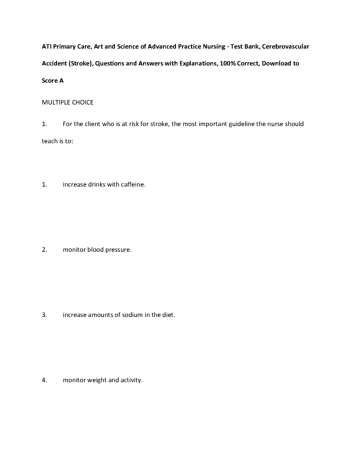 TEST BANK FOR ATI Primary Care, Art and Science of Advanced Practice Nursing, Cerebrovascular Accident (Stroke), Questions and Answers with Explanations