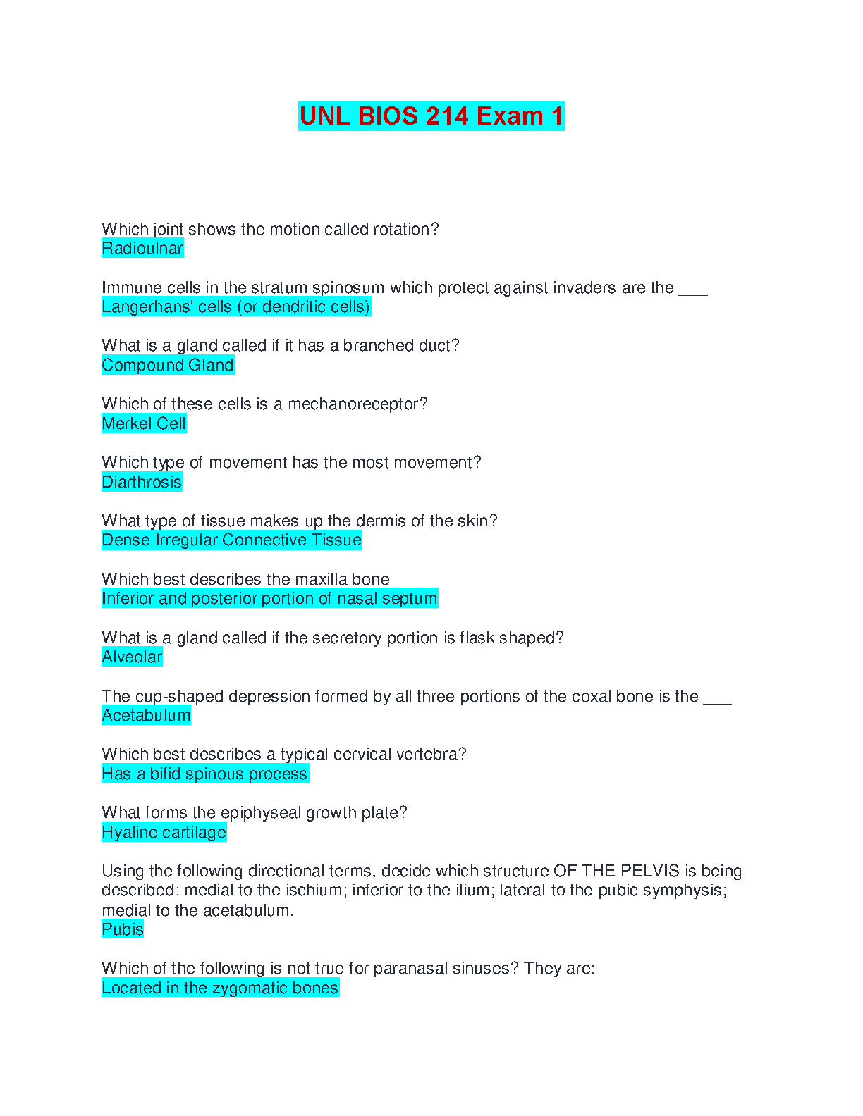 Ace your Anatomy and Physiology I exam with this comprehensive study resource for UNL BIOS 214 Exam 1. This updated 2025/2026 guide features a curated list of potential exam questions with their correct, highlighted answers, ensuring you grasp key concepts effortlessly. Master topics such as joint rotation, cellular biology, tissue identification, and skeletal anatomy. This essential tool is designed to help you pass on your first attempt and secure a top grade, eliminating the need for resits.