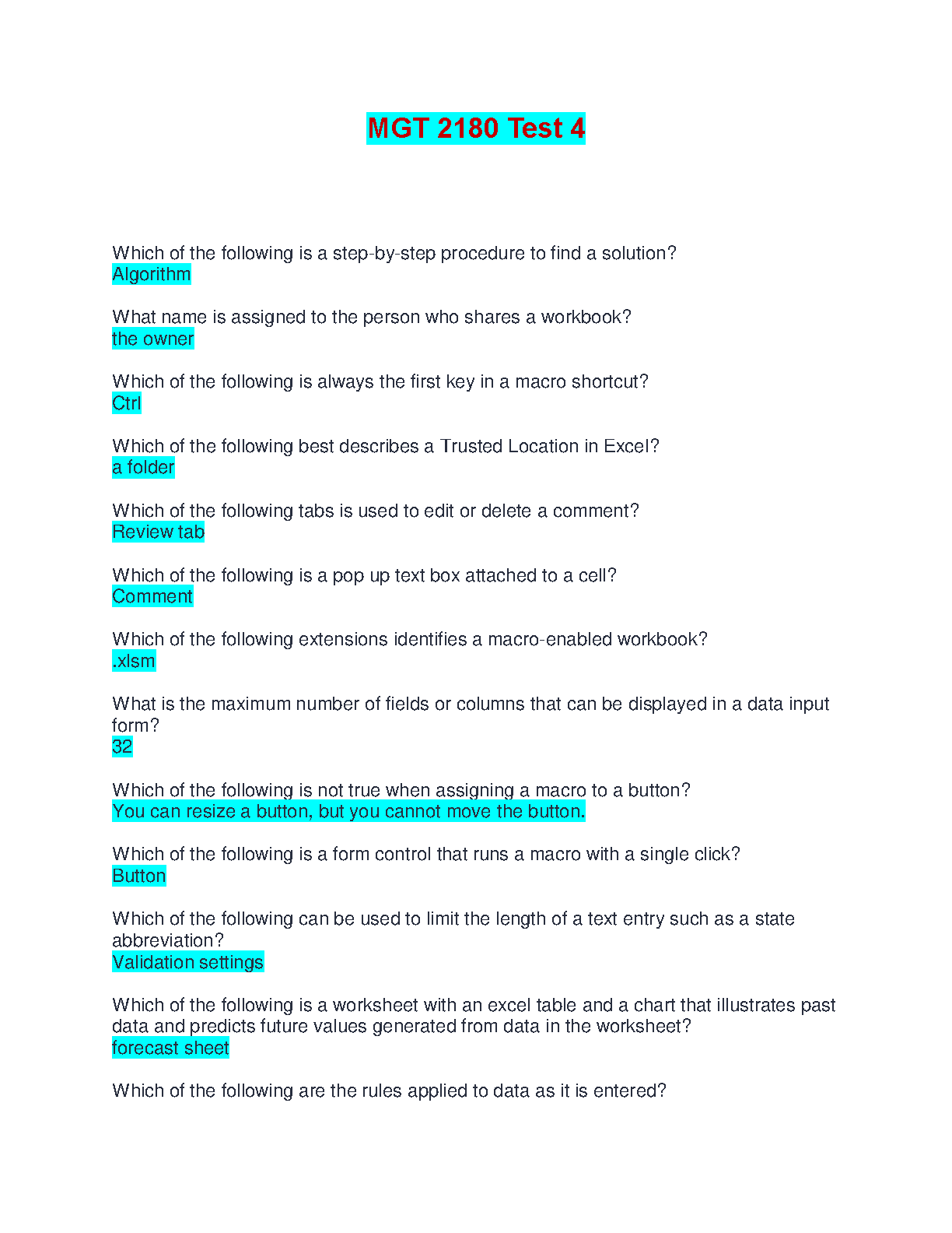 Instantly download the complete Test Bank for MGT 2180 Test 4. This invaluable resource features a full range of exam-style questions and verified correct answers, focusing on essential advanced Excel topics such as macros, trusted locations, data validation, and forecast sheets. Perfect for exam preparation, this study guide is tailored to help you master the course material and achieve a top grade in your Management Information Systems class. Get the edge you need to pass with confidence!