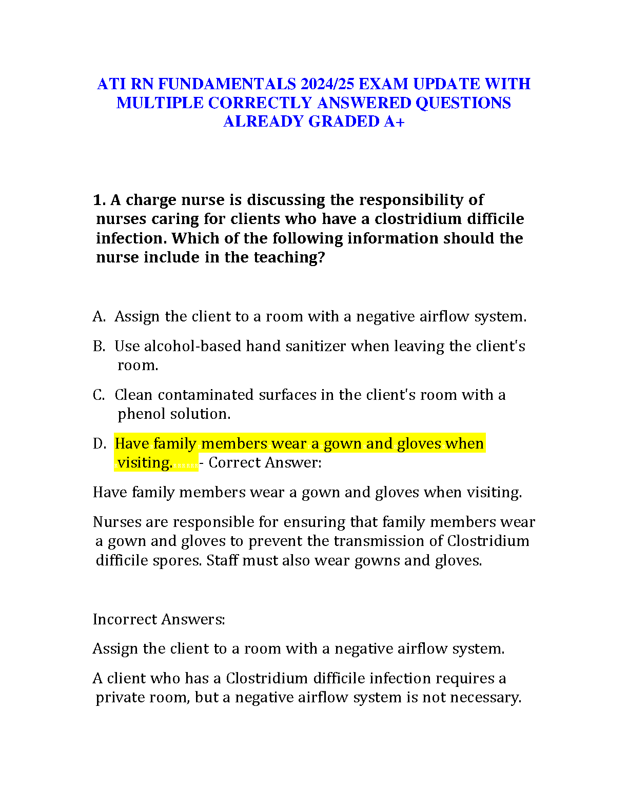 Get ready to ace your nursing exams with our latest ATI RN Fundamentals Test Bank for the 2025-2026 academic year. This comprehensive study guide is packed with A+ graded, correctly answered questions and detailed rationales. Each question is designed to mirror the actual exam, helping you master key concepts in fundamental nursing care. Stop worrying about resits and secure your success on the first attempt. This essential resource covers all the core topics you need to know, providing clear explanations to deepen your understanding and boost your confidence.