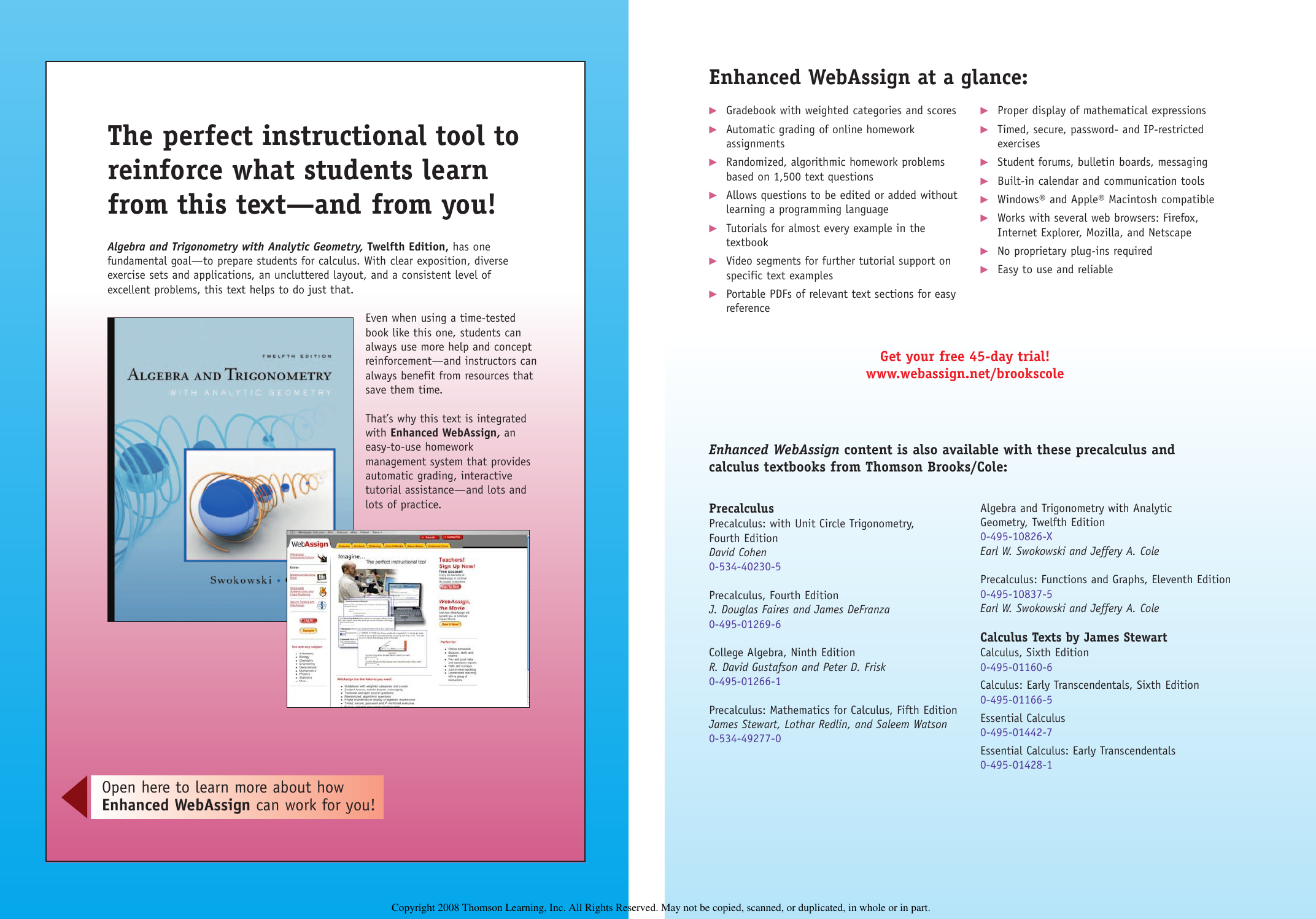 Unlock your full potential and conquer your exams with the official Test Bank for 'Algebra and Trigonometry with Analytic Geometry,' 12th Edition by Earl W. Swokowski and Jeffery A. Cole. This essential resource provides an extensive collection of real exam questions, complete with detailed answers, directly from the publisher. Move beyond simple memorization and gain a deep understanding of core concepts. This comprehensive study tool is your key to mastering the material, boosting your confidence, and achieving top grades on your first try.