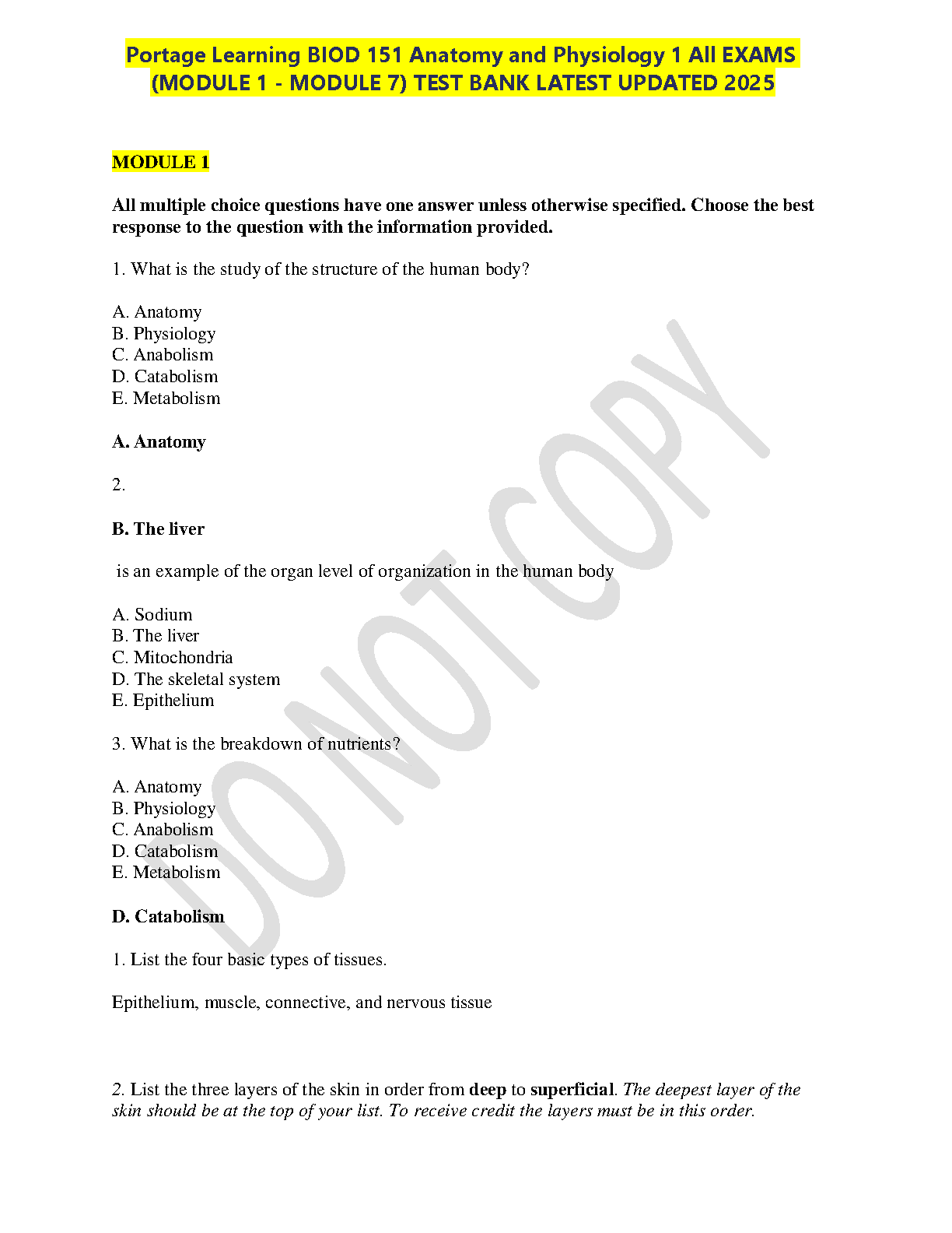 Unlock academic success in your Portage Learning course with the complete test bank for BIOD 151 Anatomy and Physiology 1. This updated 2025 resource covers all material from Module 1 through Module 7, providing you with every exam question and its verified answer. Master key concepts, practice with real exam-style questions, and gain the confidence to ace your tests. This essential study guide is your key to understanding complex topics and securing a top grade in A&P 1.