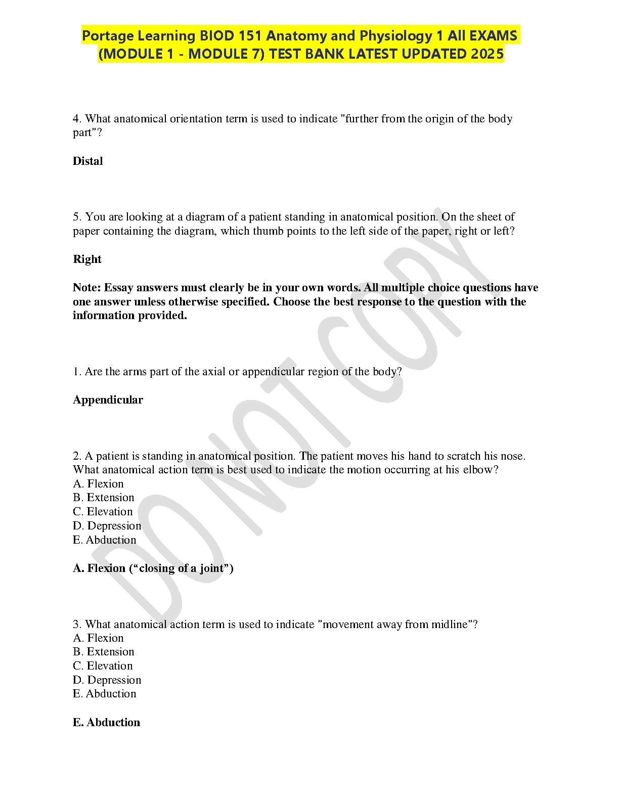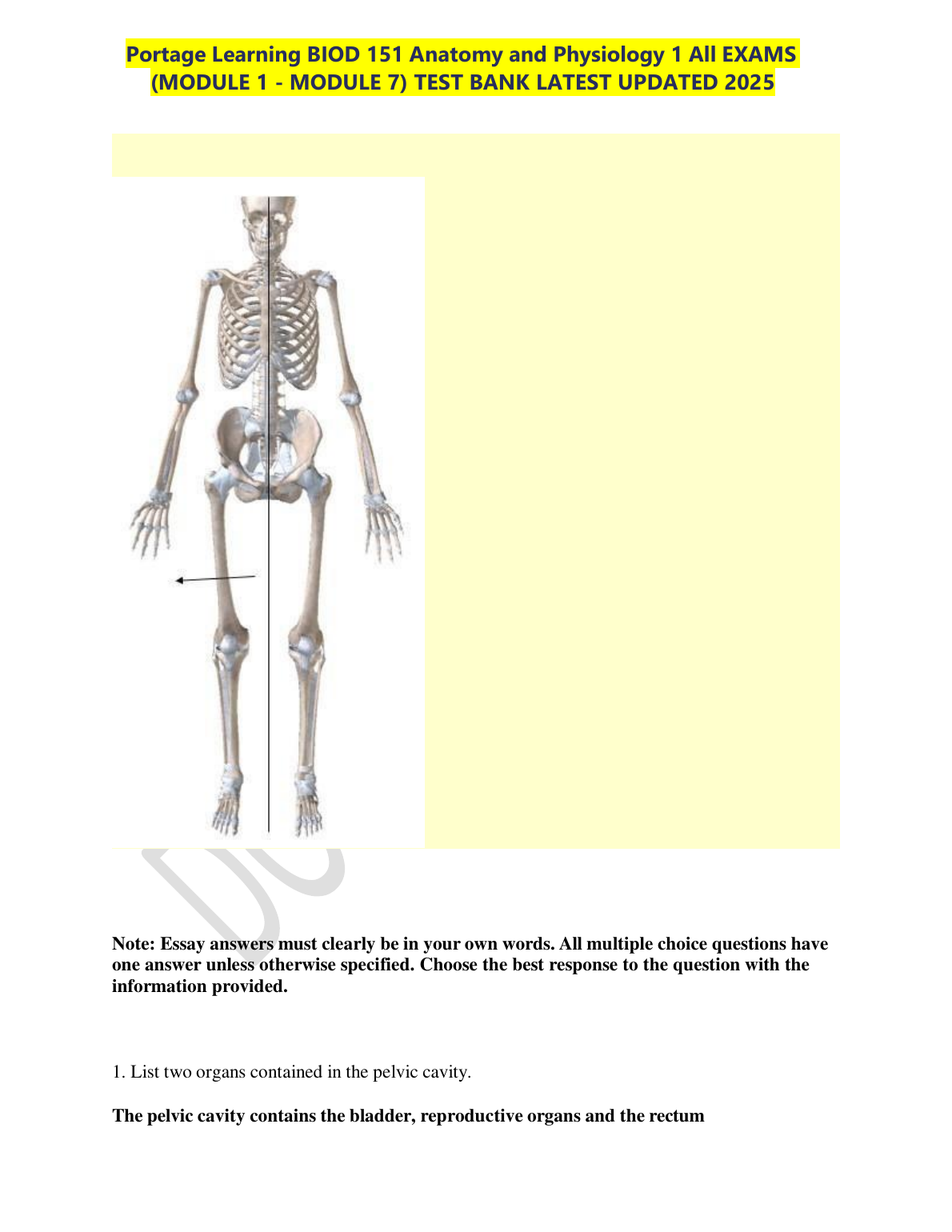 BIOD 151 Anatomy and Physiology 1 Test Bank (Modules 1-7 Exams with Answers) - Portage Learning | Latest 2025 Edition