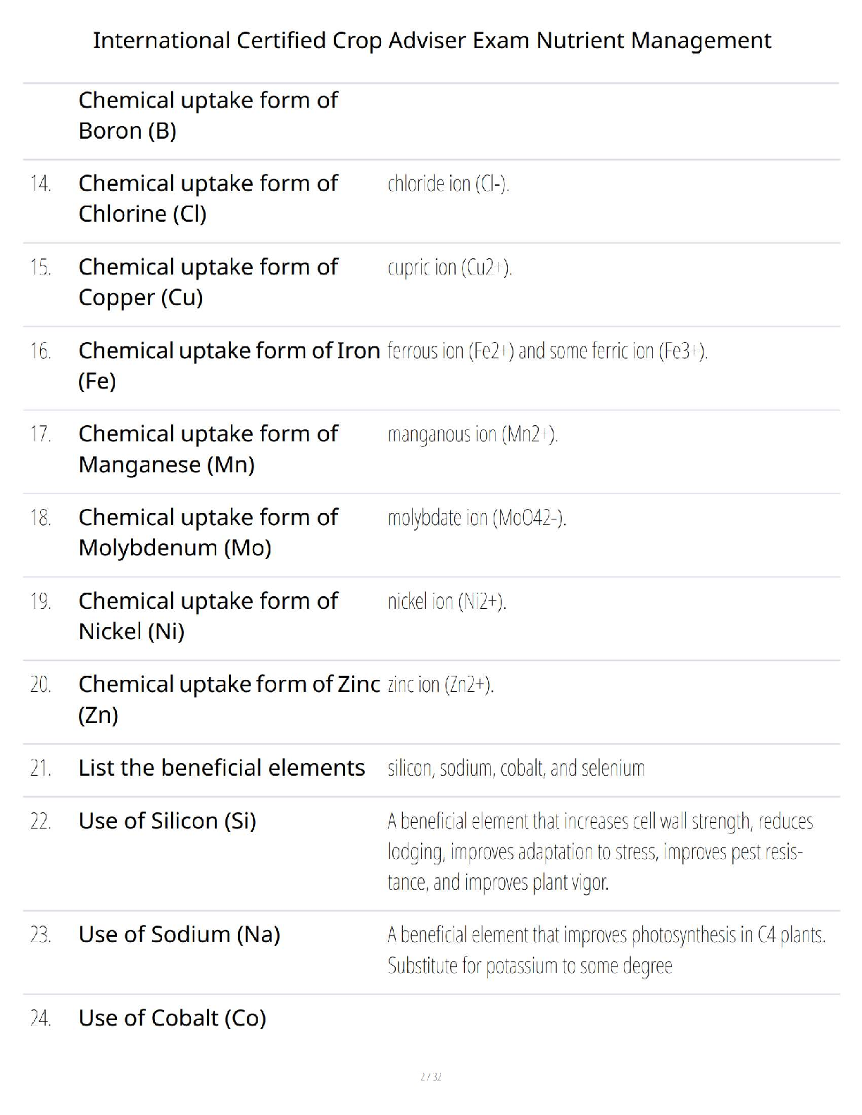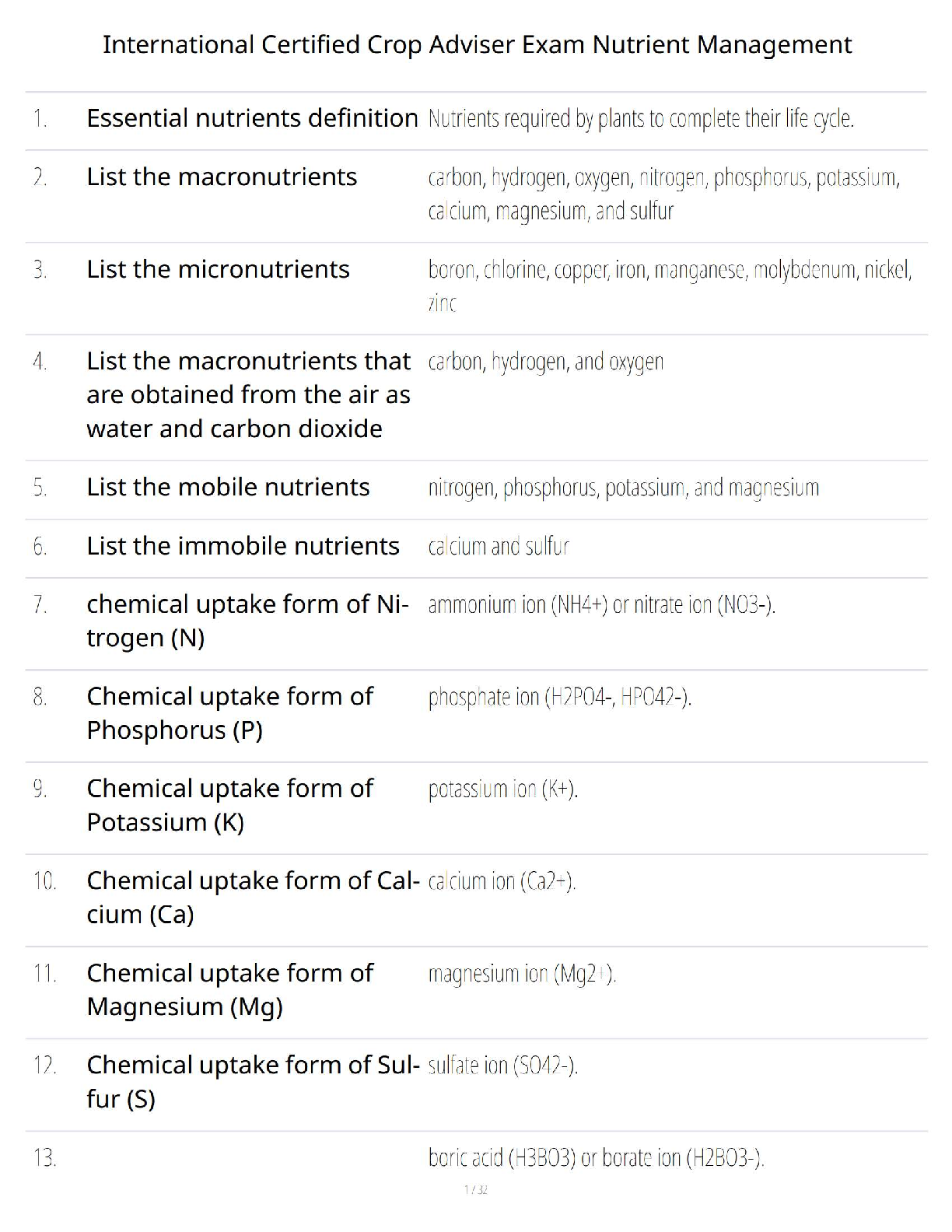 Unlock your success in the International Certified Crop Adviser (CCA) exam with our comprehensive Nutrient Management study guide, fully updated for the 2025/2026 testing cycle. This essential resource provides a detailed question-and-answer format covering all critical topics, including the definition of essential nutrients, identification of macronutrients and micronutrients, mobile vs. immobile nutrients, and the specific chemical uptake forms of Nitrogen (N), Phosphorus (P), Potassium (K), and more. Designed to help you master the material efficiently and pass on your first attempt, this guide is your key to avoiding resits and achieving your CCA certification.