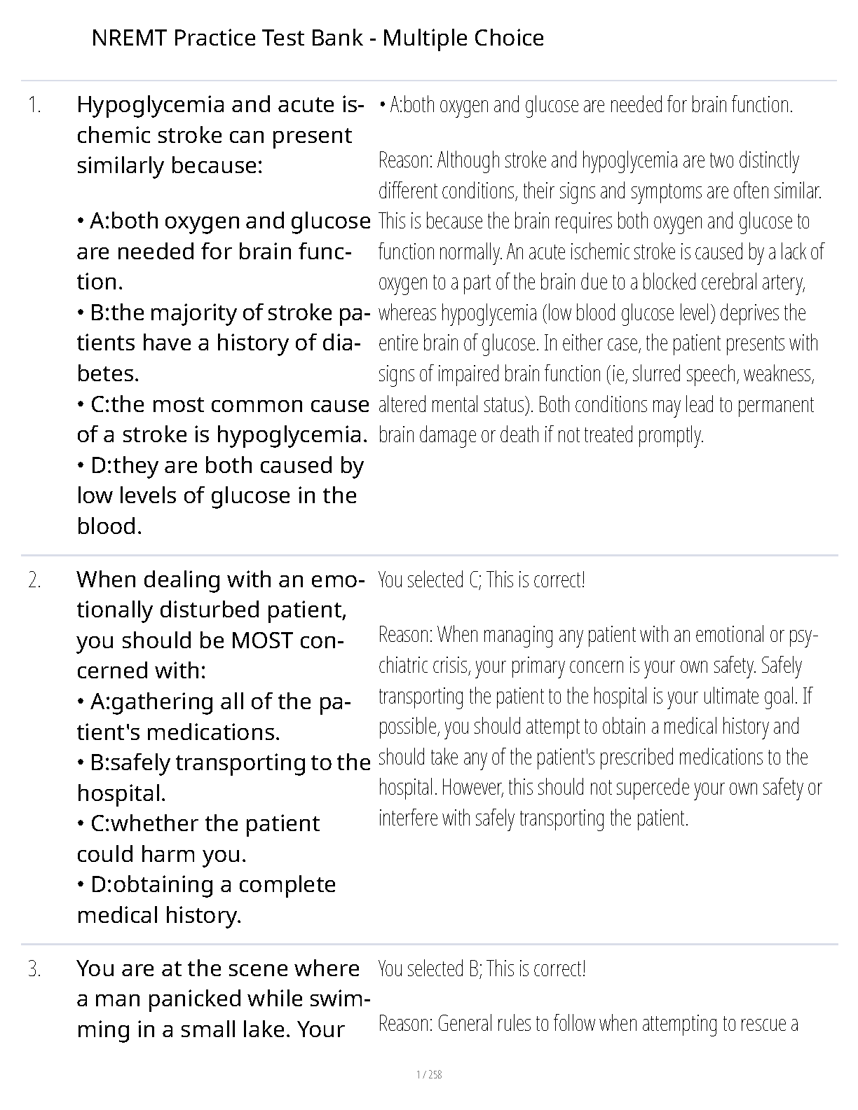 Ace your NREMT certification exam with our premier test bank for the 2025/2026 academic year. This comprehensive resource is packed with hundreds of practice multiple-choice questions, each accompanied by a correct answer and a detailed rationale to deepen your understanding. Spanning all critical NREMT topics, from differentiating medical emergencies like stroke and hypoglycemia to managing psychiatric patients and rescue scenarios, this guide is meticulously designed to help you master the material. Stop worrying about resits and gain the confidence you need to pass on your very first attempt. Download now and start your journey to becoming a certified EMT.