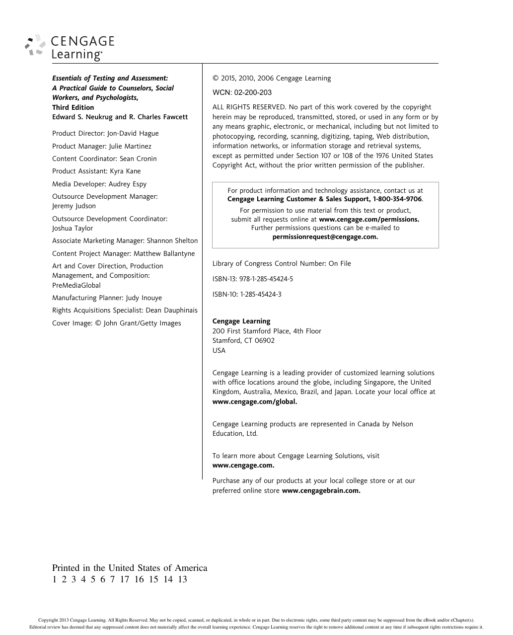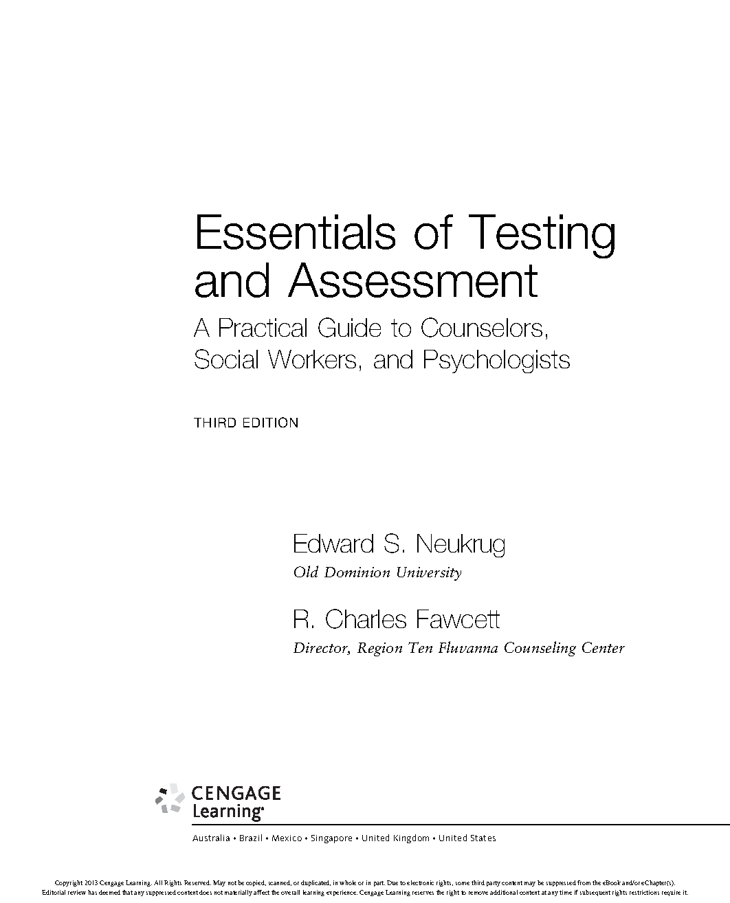 Test Bank for The Essentials of Testing and Assessment: A Practical Guide to Counselors, Social Workers, and Psychologists, 3rd Edition by Edward S. Neukrug, R. Charles Fawcett
