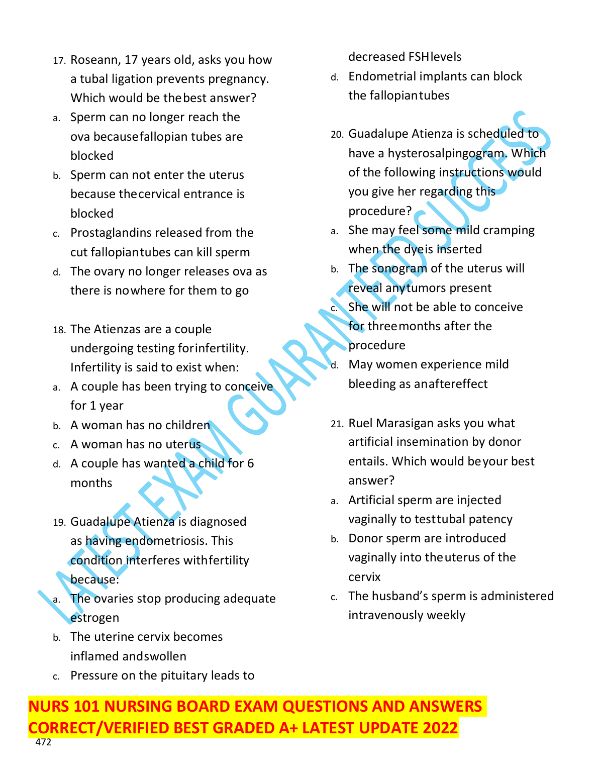Get ready to ace your NURS 101 exams with this comprehensive test bank for Maternity Nursing Part 2. This invaluable resource features a wide range of verified exam-style questions complete with accurate answers. Designed to deepen your understanding of key concepts in maternal and child health, this study guide is your key to achieving an A+ grade. Stop worrying about resits and secure your success on the first try by mastering the topics covered in this essential NURS 101 test bank.