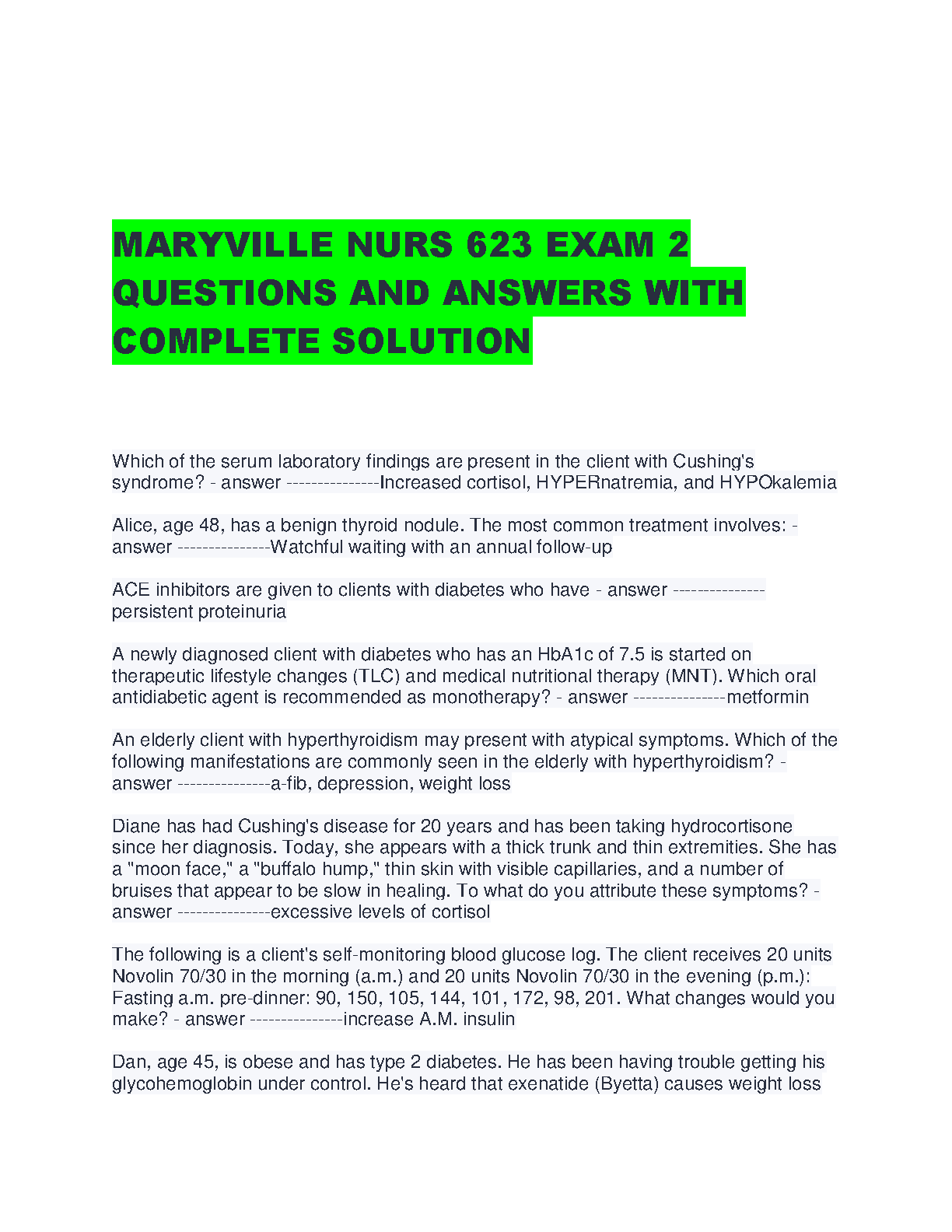 Unlock exam success with the latest 2025/2026 Test Bank for Maryville University's NURS 623 Exam 2. This comprehensive study guide provides a complete set of verified questions with 100% correct and detailed answers, covering key topics such as Cushing's syndrome, diabetes management, thyroid disorders, and more. This resource is expertly designed to help you understand complex concepts, prepare effectively, and pass with confidence on your first attempt, ensuring you achieve top marks.