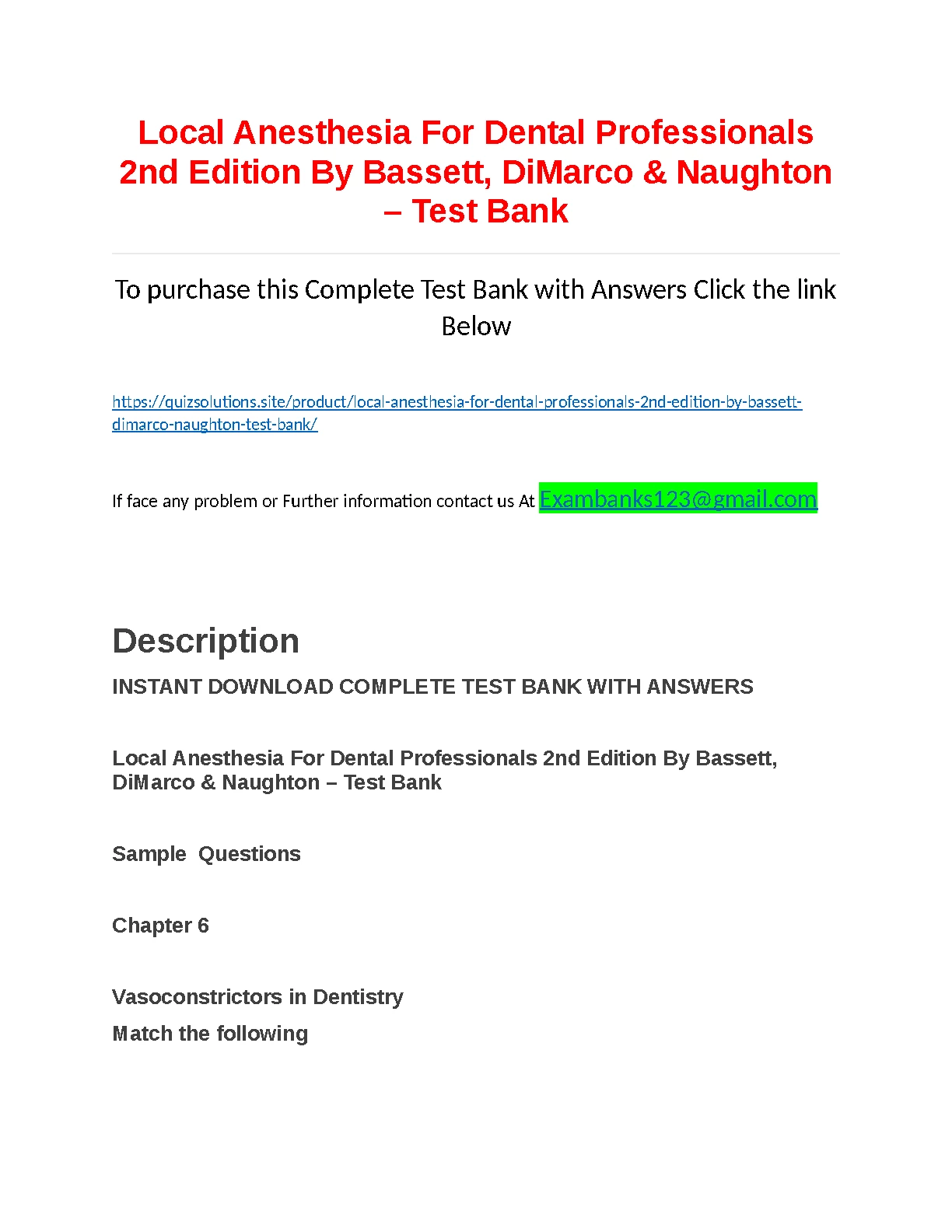 Test Bank For Local Anesthesia For Dental Professionals 2nd Edition By Bassett, DiMarco & Naughton. DOWNLOAD on www.hackedexams.com INSTANTLY.