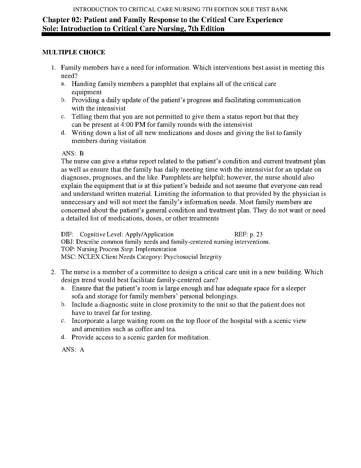 Test Bank for Introduction to Critical Care Nursing 7th Edition by Sole