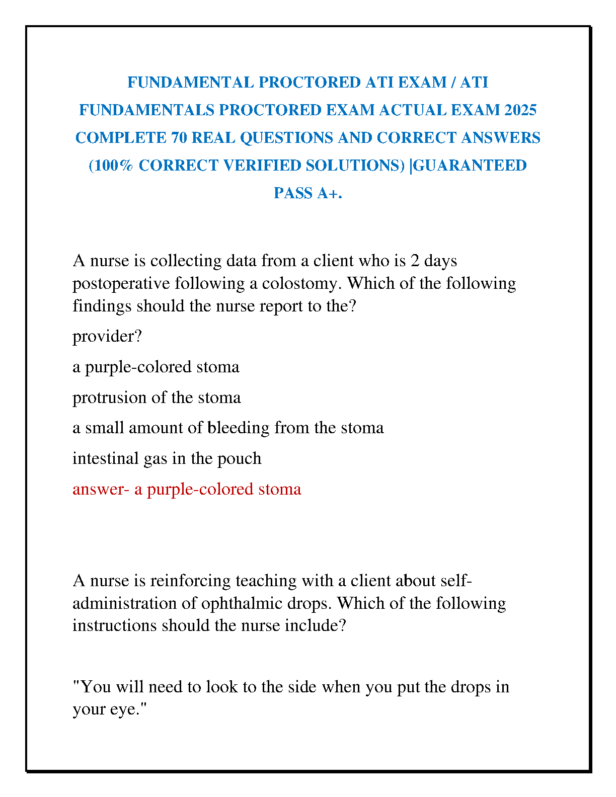 Ace your ATI Fundamentals Proctored Exam with our comprehensive 2025 test bank! This essential study guide features 70 real exam questions, each with a 100% correct, verified answer. Designed specifically for nursing students, this resource helps you master fundamental nursing concepts, understand the exam format, and build the confidence needed to pass with an A+ on your first try. Stop worrying about resits and start studying smarter with our guaranteed success package.