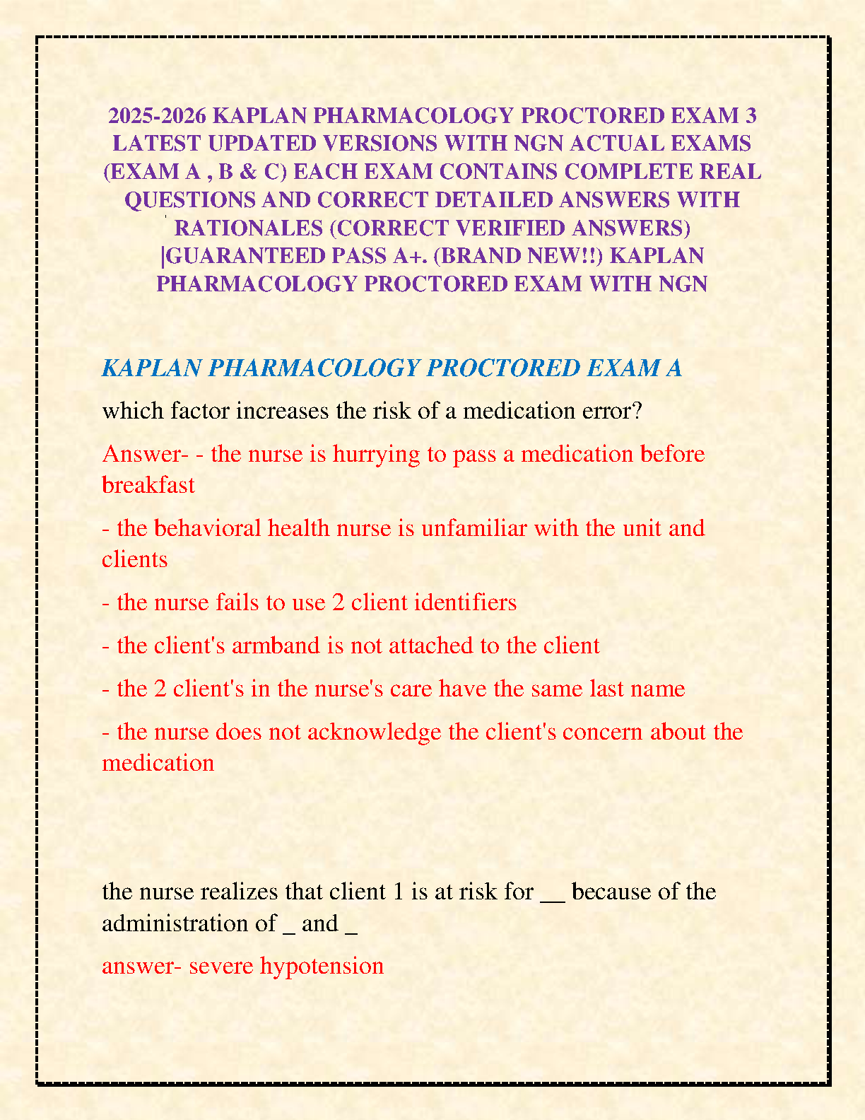 Secure your A+ with confidence using the latest 2025-2026 Kaplan Pharmacology Proctored Exam 3 Test Bank. This complete study package features three updated versions (Exams A, B, and C), all aligned with the Next Generation NCLEX (NGN) format. Inside, you'll find a comprehensive collection of actual exam questions, each accompanied by correct, verified answers and in-depth rationales. This resource is expertly designed to deepen your understanding, boost your test-taking skills, and help you pass your pharmacology exam on the very first try.