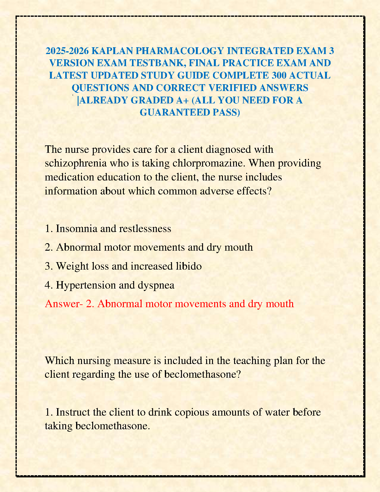 Ace your nursing pharmacology finals with our latest 2025-2026 Kaplan Pharmacology Integrated Exam 3 Test Bank. This comprehensive study guide features 300 meticulously compiled questions paired with correct, verified answers. Designed to mirror the actual exam, this A+ graded resource covers all critical topics, ensuring you have everything you need to pass on your first attempt. Boost your confidence and secure your success with this essential final practice exam tool.